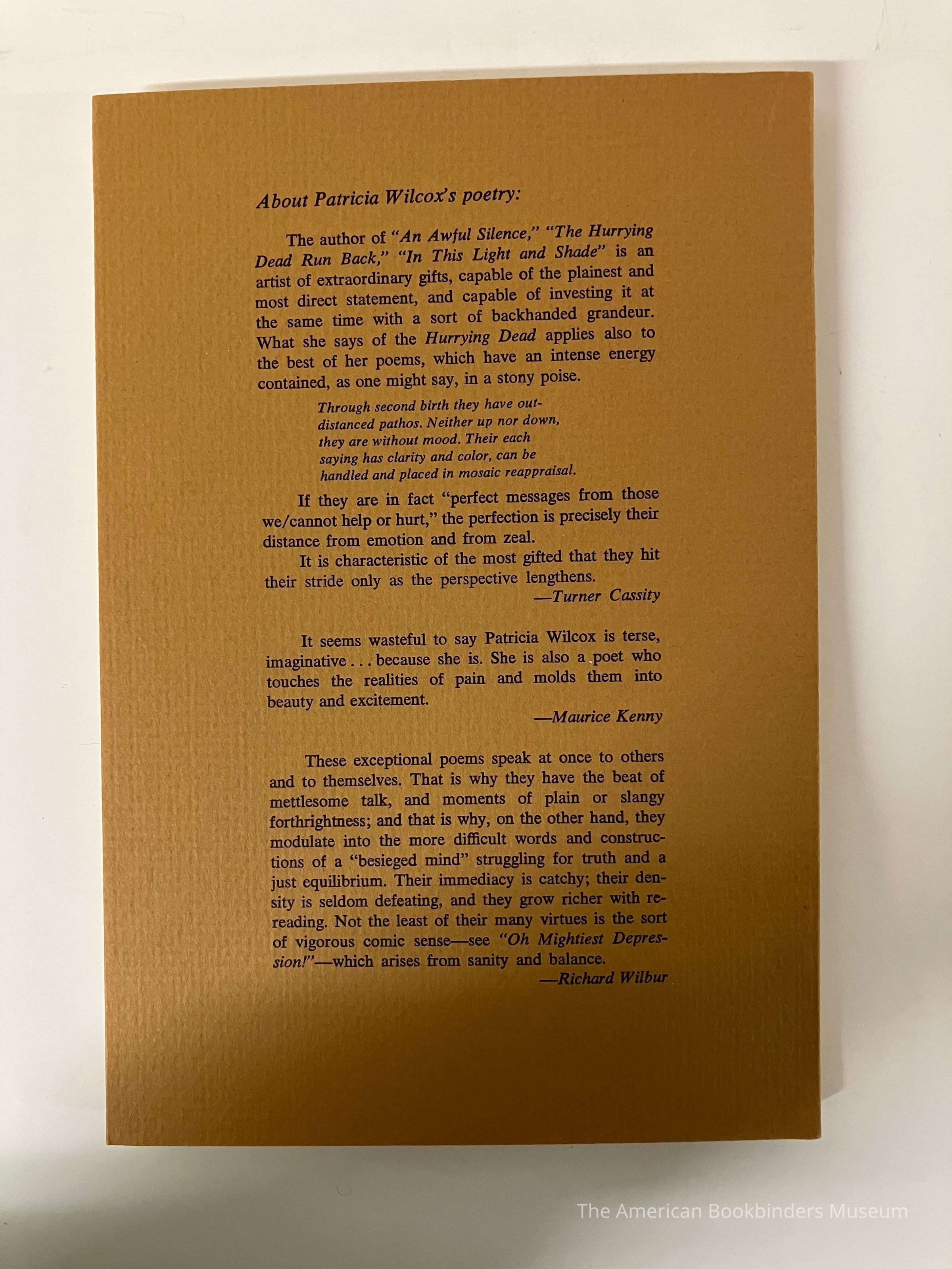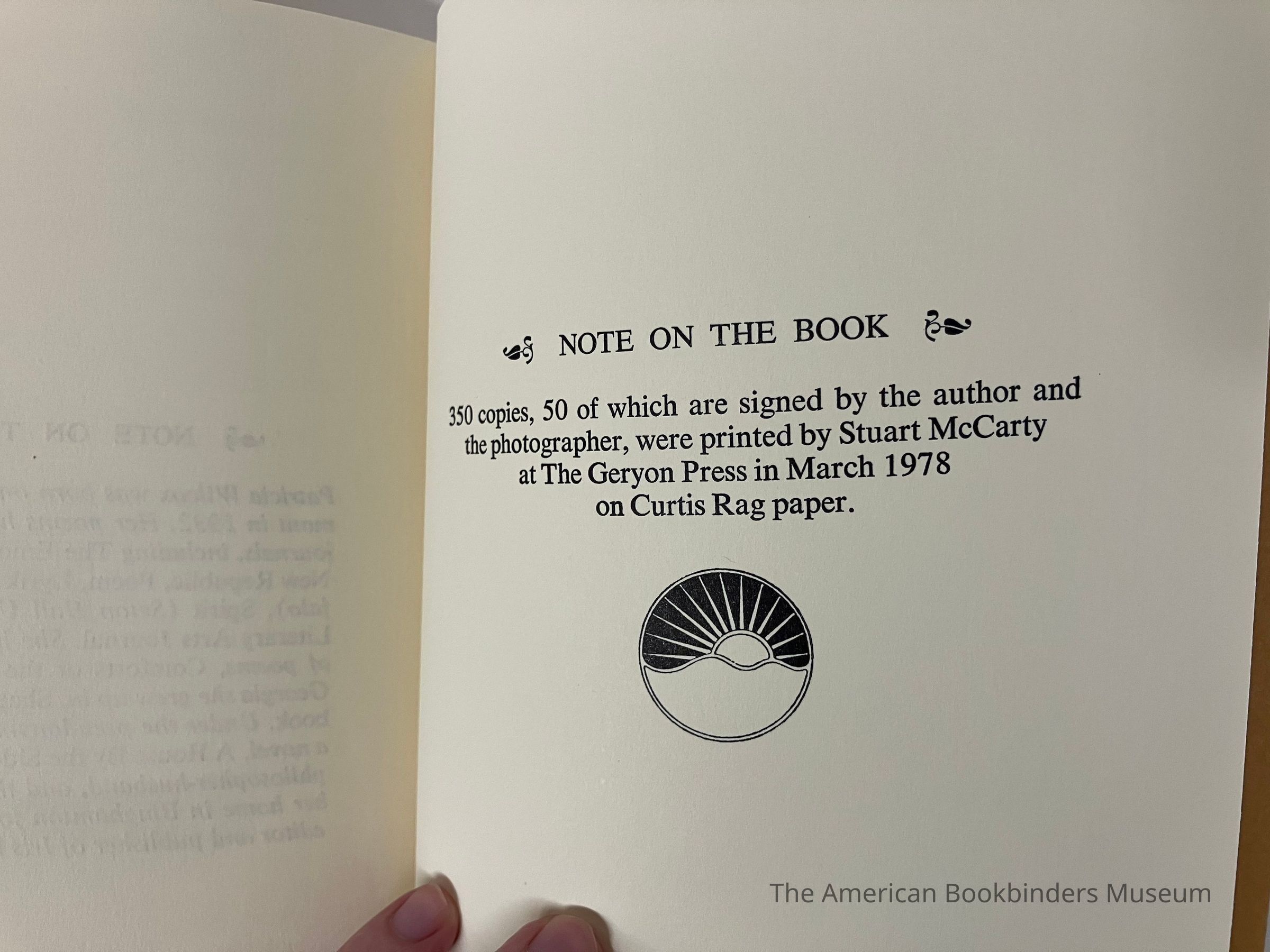 From colophon at back - 350 copies, 50 signed by author and photographer, printed letterpress by Stuart McCarty at the Geryon Press in March 1978 on Curtis Rag Paper.