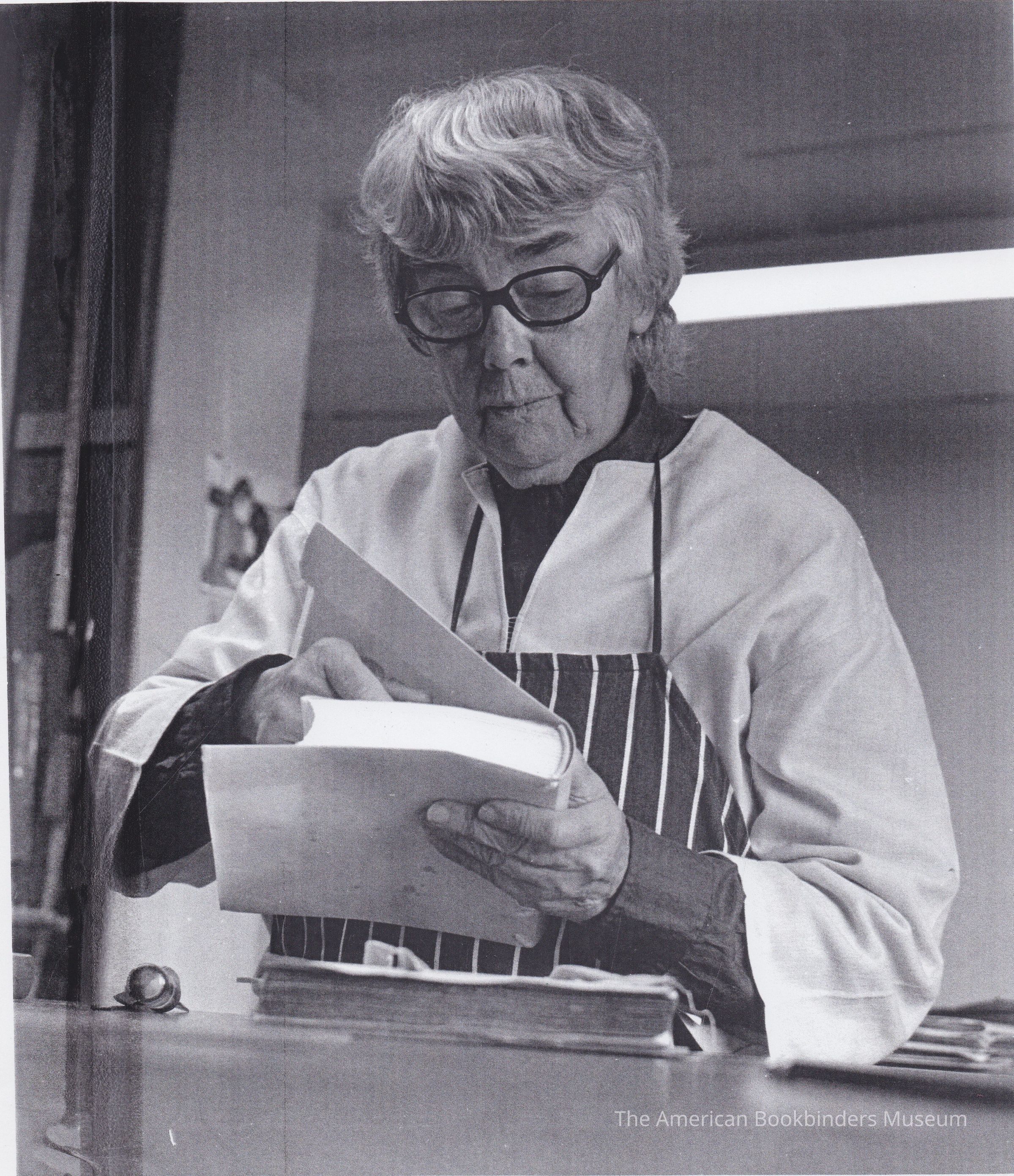 A black and white photo showing Patri in her workshop, working on a limp vellum binding.Photograph Details
