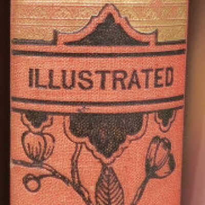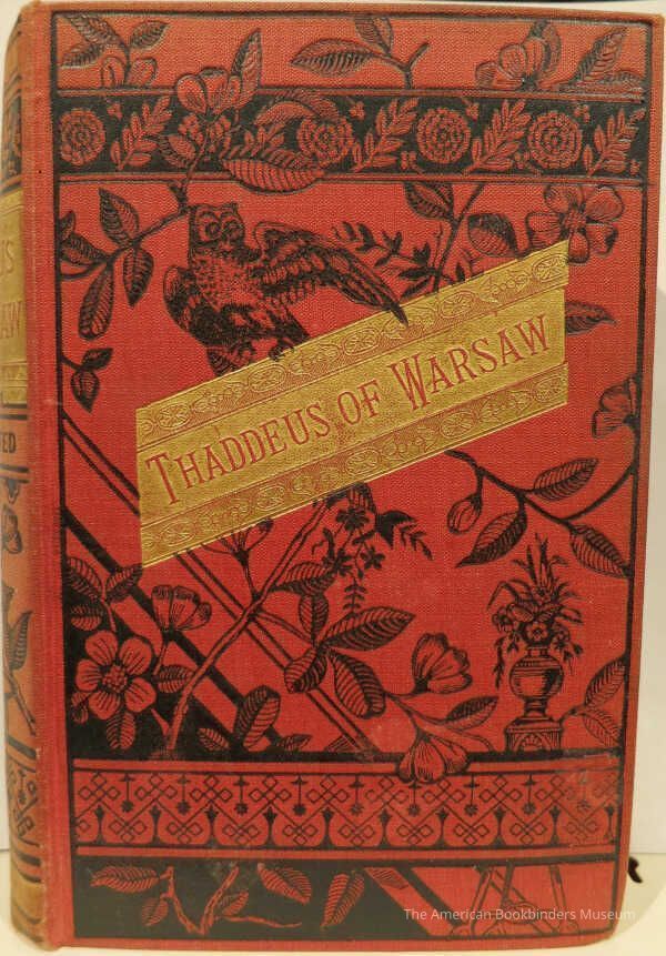 Bound in red cloth with elaborate black stamping to cover and spine of a bordered Asian-inspired leaf, branch, and flower design with a diagonal orientation. Urns with flowers, an owl, and a title ribbon band to the cover stamped in gilt. Cover stamping fills the entire board and spine. Spine has a wide title band stamped in gilt. Yellow endpapers.
