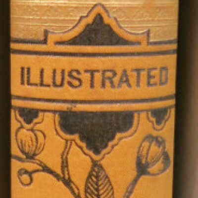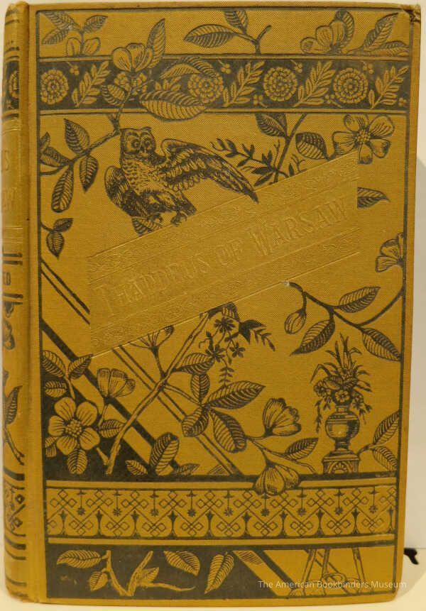 Bound in mustard yellow cloth with elaborate black stamping to cover and spine of a bordered Asian-inspired leaf, branch, and flower design with a diagonal orientation. Urns with flowers, an owl, and a title ribbon band to the cover stamped in gilt. Cover stamping fills the entire board and spine. Spine has a wide title band stamped in gilt. Yellow endpapers.