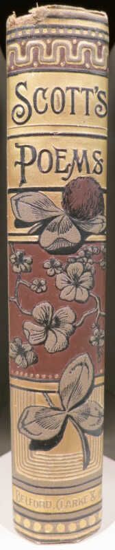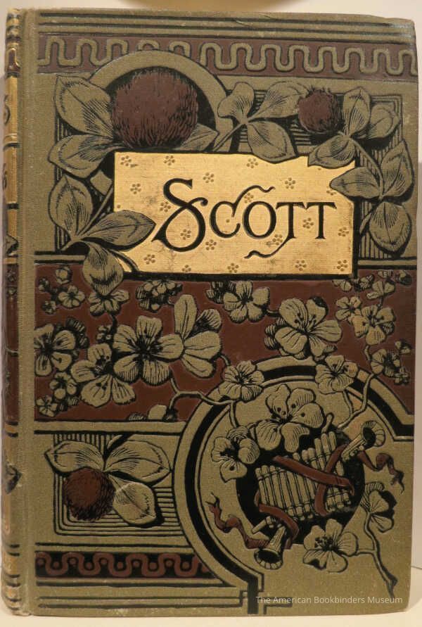 Bound in putty colored cloth with black and brown stamping. Elaborate spine decoration featuring three leafed clovers and flowers with the top clover entering the wide gilt stamped title band. Publisher's name to bottom of spine stamped in gilt. Same motif to front board with black stamped title within gilt rectangle Geometric patterned endpapers. All edges gilt.Notes