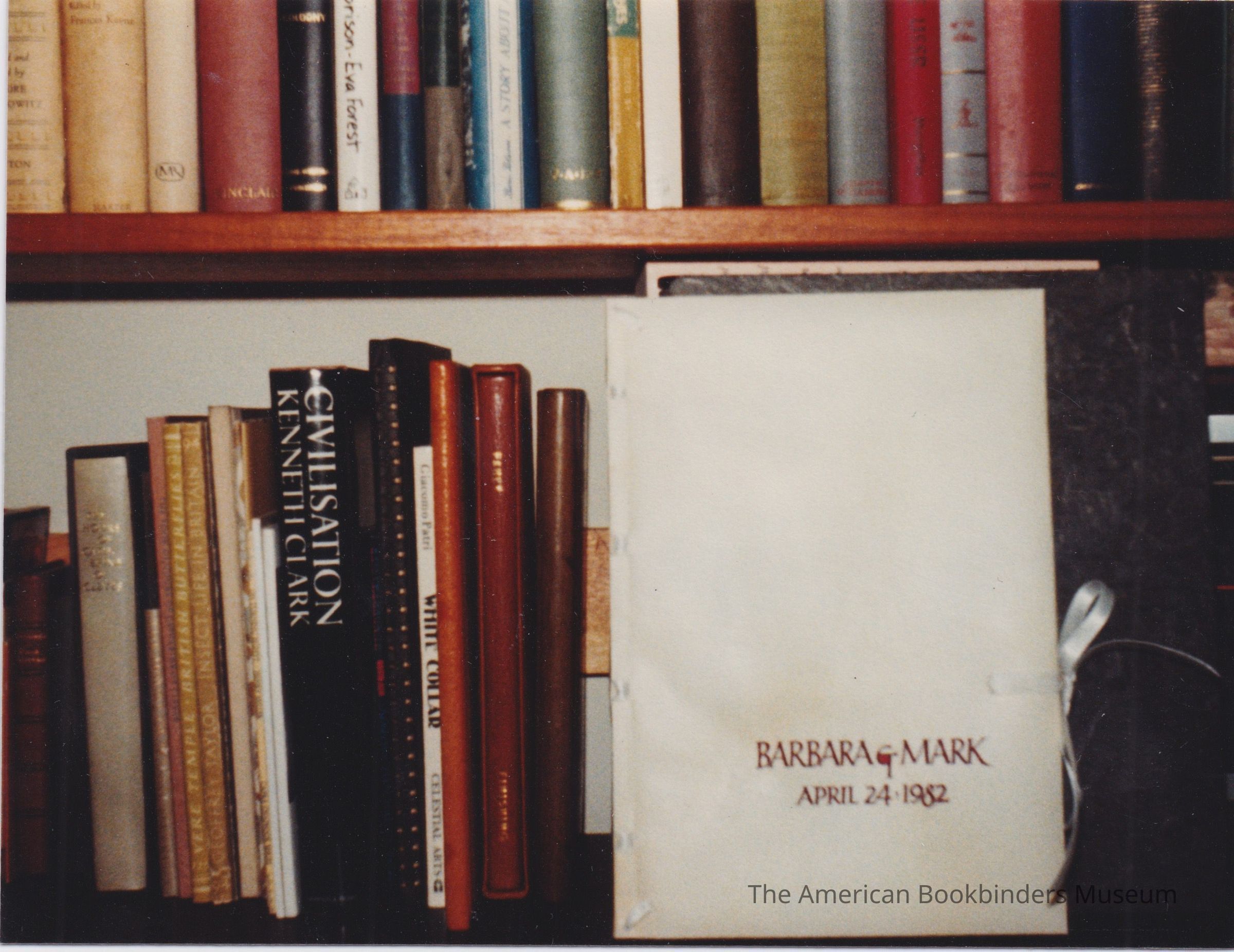 Books on a book case. One is facing the camera, showing 'Barbara G Mark April 24 1982'.