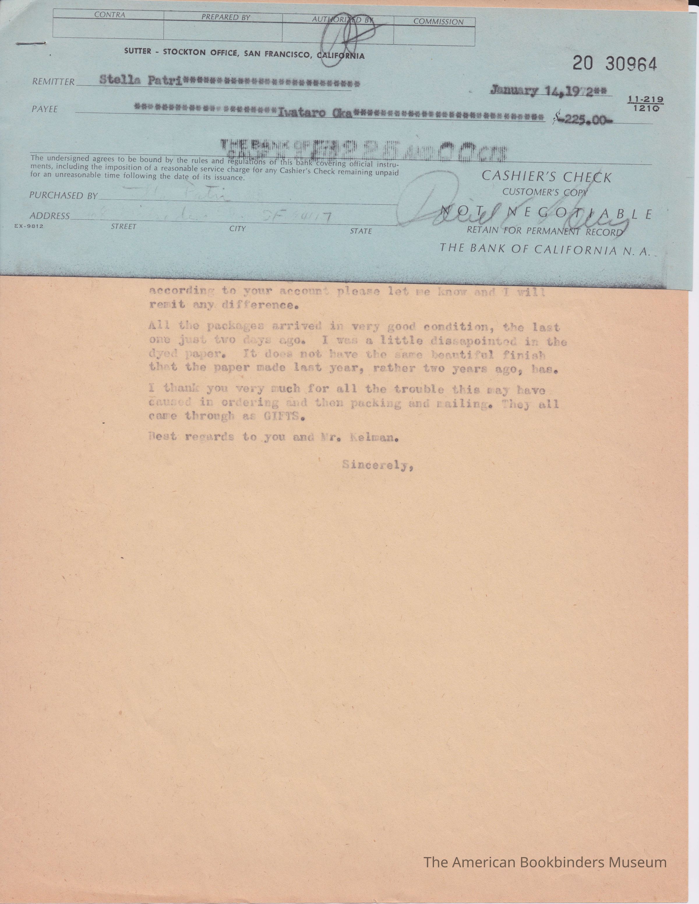 Check receipt for Patri for the rest of the payment for the papers. A letter notifying Oka the papers all arrived.Collection