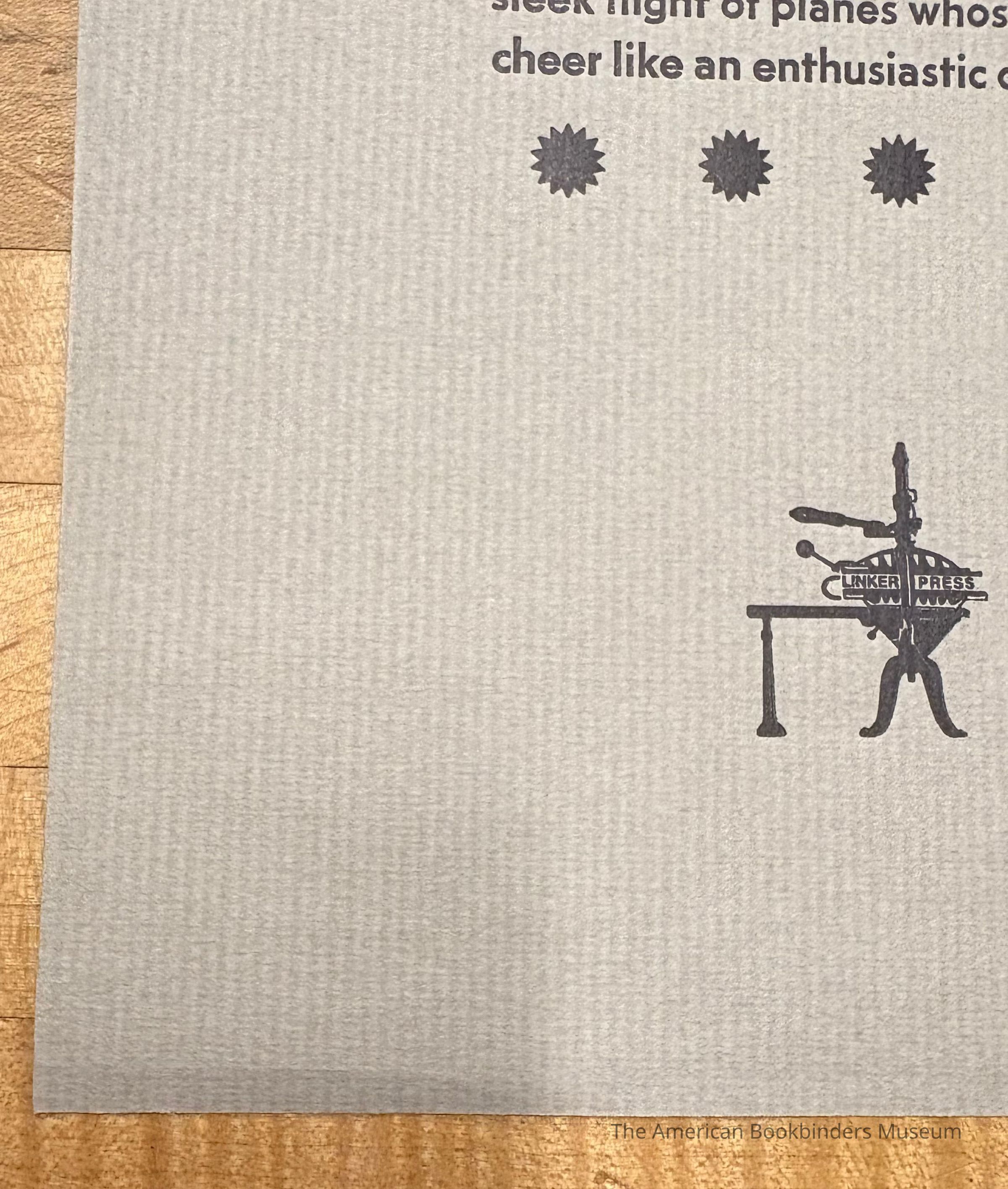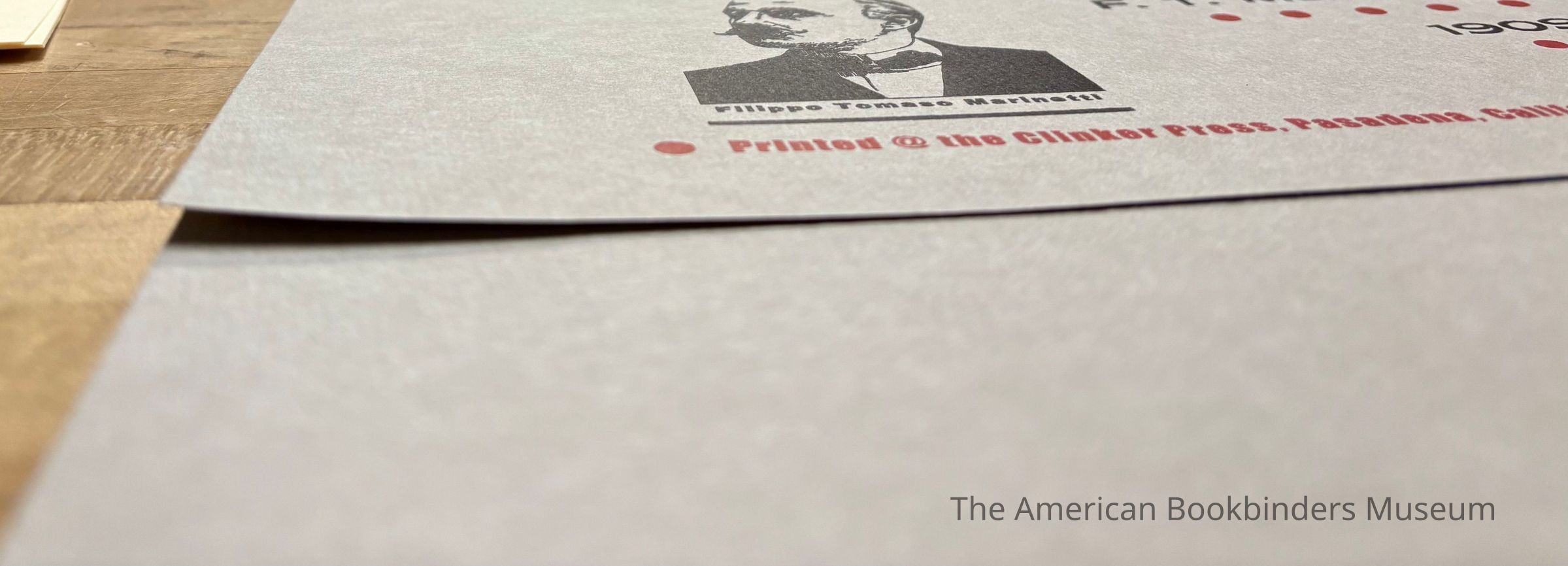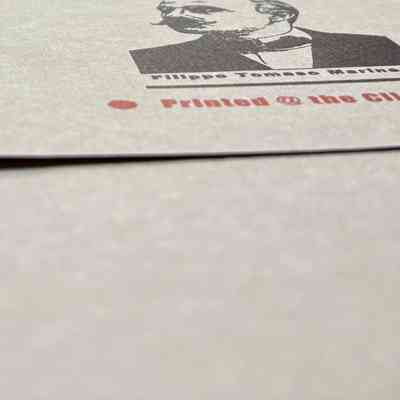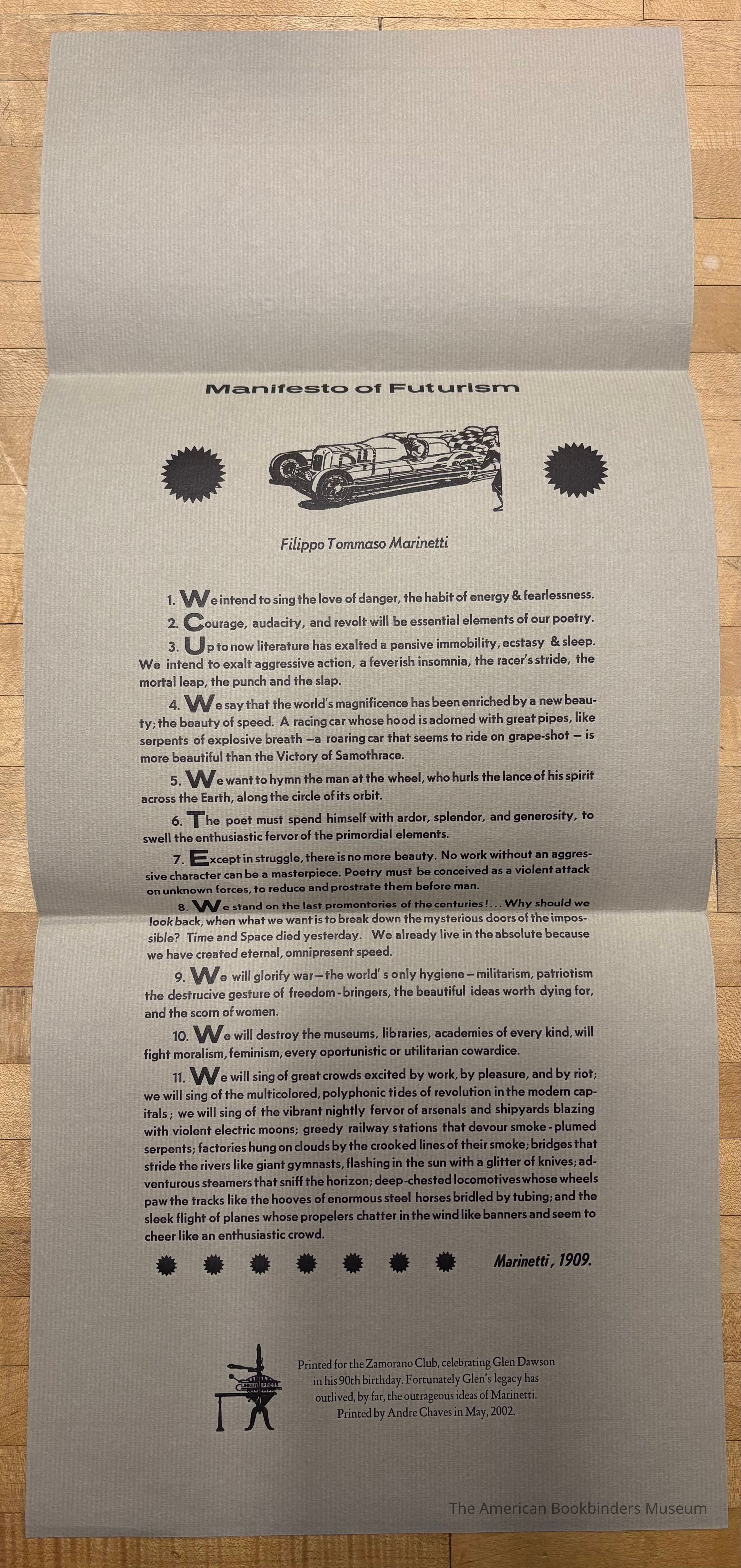 Folded grey sheet printed on both sides, including an illustration of Marinetti on the front and a piece of writing from Marinetti on the inner folded side.Collection