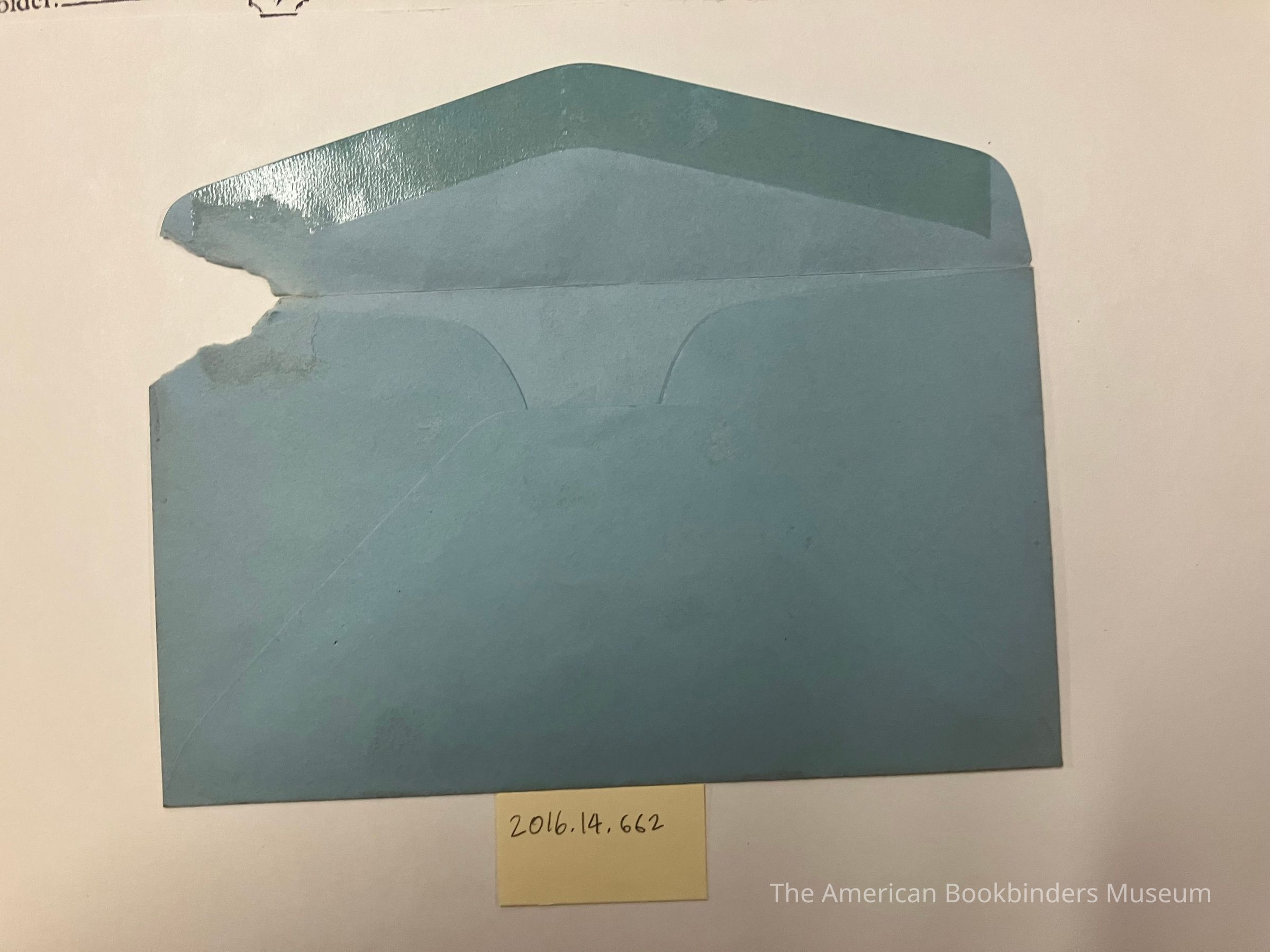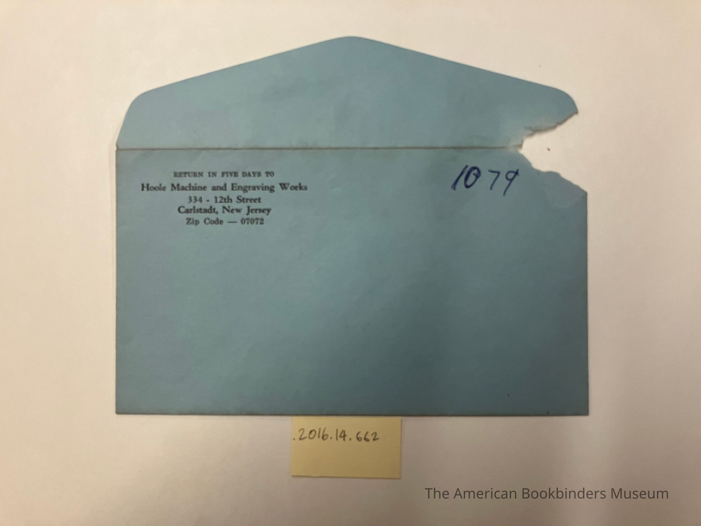 Blue envelope with '1079' written on the front. Envelope came from Hoole Machine and Engraving Works.Collection