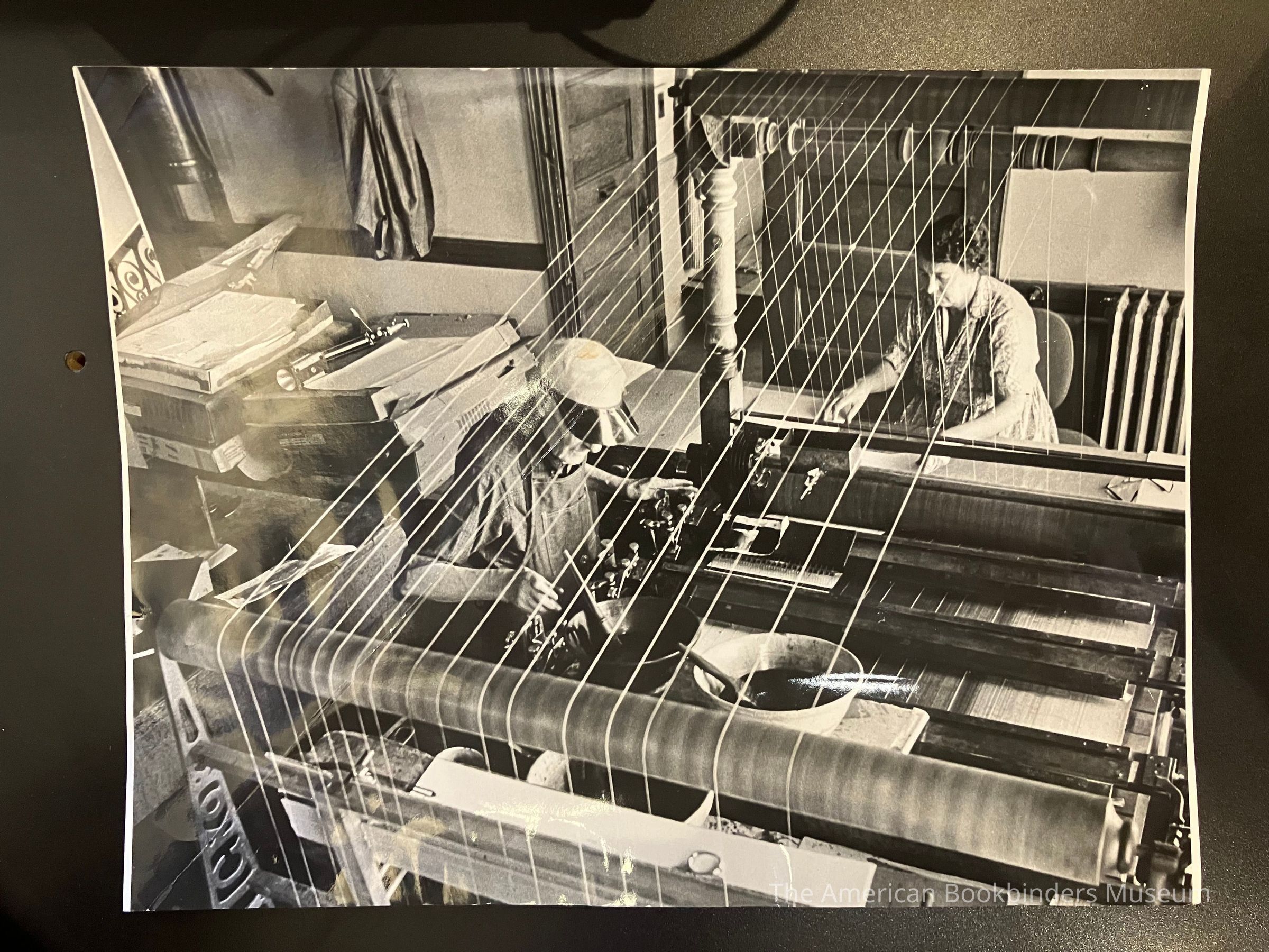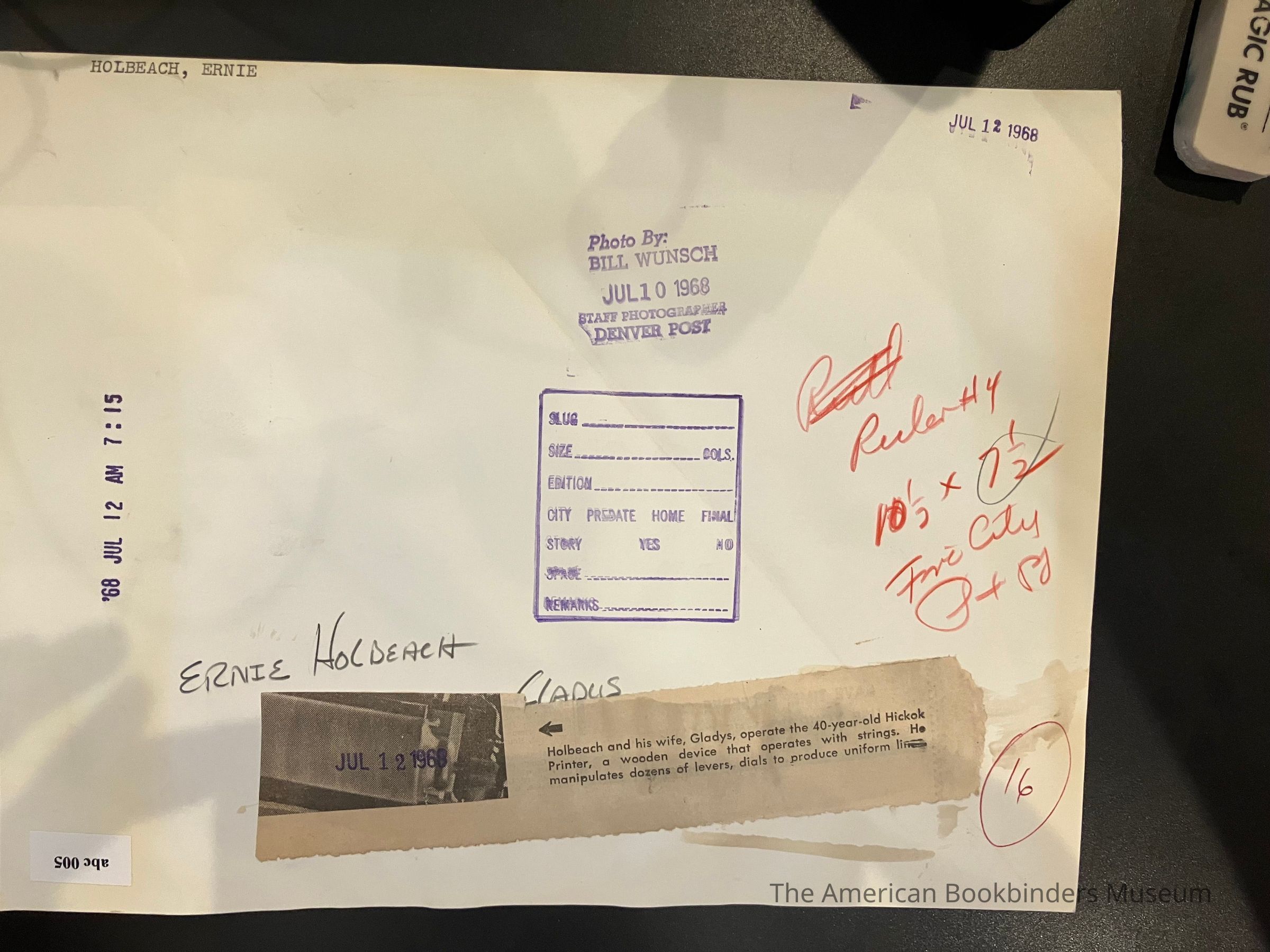 A photo showing two figures operating a ledger ruler/pen ruler. A Hickok Printer, which uses strings to manipulate levers and dials. Gladys sits at the far end while Ernie Holbeach is standing on one side. Two pots of ink are resting on top. On the back is a small section of newspaper, appearing to show the same photo, with a small description of Holbeach.Photograph Details