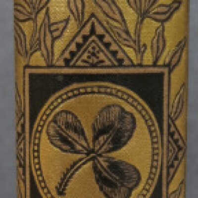 Bound in light brown beveled cloth with black and gilt stamping of intricate borders of flowers, leaves, repeat patterns, and classical urn. Eastlake elements. Spine features a classical urn and a three leaf clover. Publisher's name in gilt to the bottom of spine reads "Belford, Clarke and Co. All edges gilt. Tan floral endpapers.