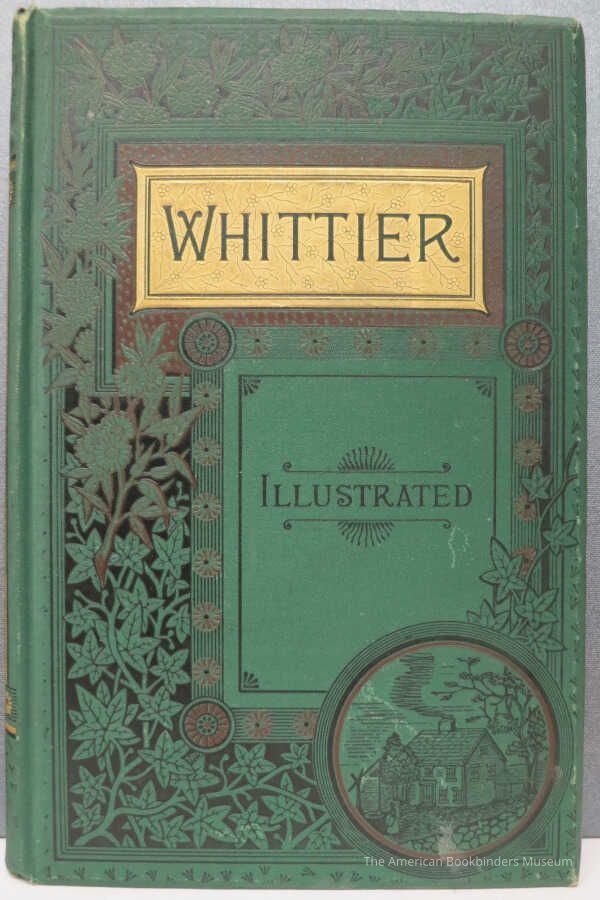 An extremely popular binding design of the 1880s, which was issued by multiple publishers with minimal changes. Note similarity to Tennyson, published by Nims and Knight. Note also the lack of contrast in this green cloth choice for Whittier, compared to the lighter tan cloth color issued the same year by the same publisher.Collection