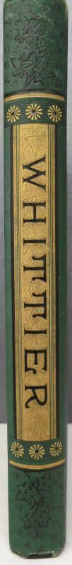 Bound in '80's green beveled cloth with a left vertical and top panel of climbing vine with leaf and flower. Stamped in black and red. Medallion stamping in black to bottom right of Whittier's home. Title stamped in dark green to rectangular gilt panel on cover, also on vertical length of spine. Dark brown stone endpapers. All edges gilt.Relationships