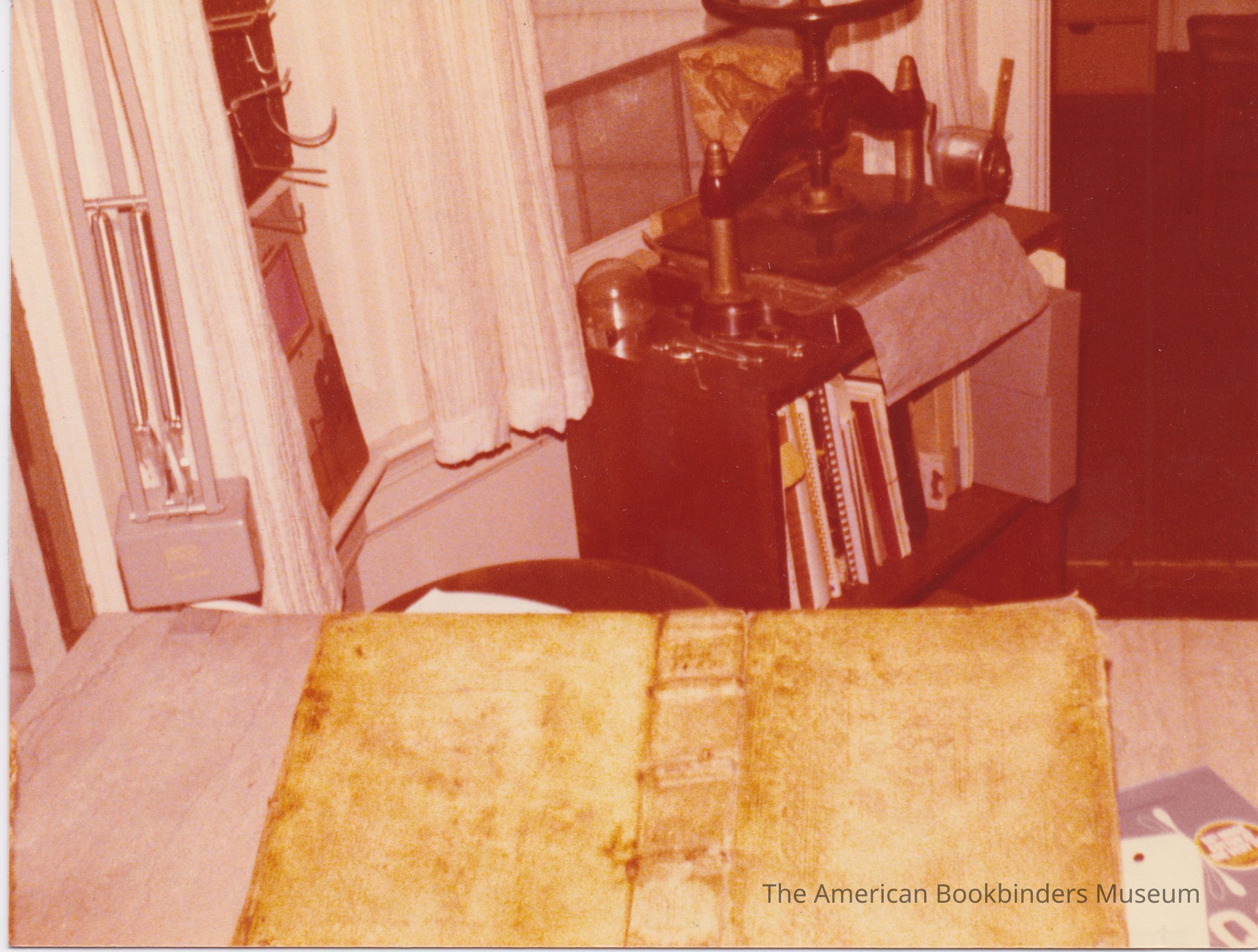 Photo of a book on a worktable. IN the background is a nipping press. The press is on allow bookcase filled with documents. The photo has a red cast.Collection