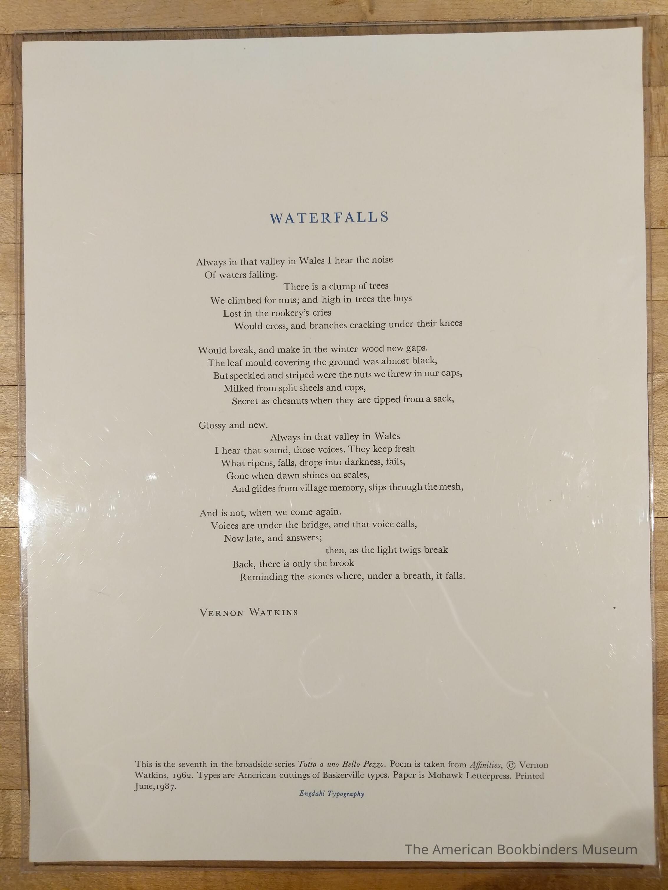 "This is the seventh in the broadsides series Tutto a uno Bello Pezzo. Poem is taken from Affinities, (c) Vernon Watkins, 1962. Types are American cuttings of Baskerville types. Paper is Mohawk Letterpress. Printed June, 1987."Collection