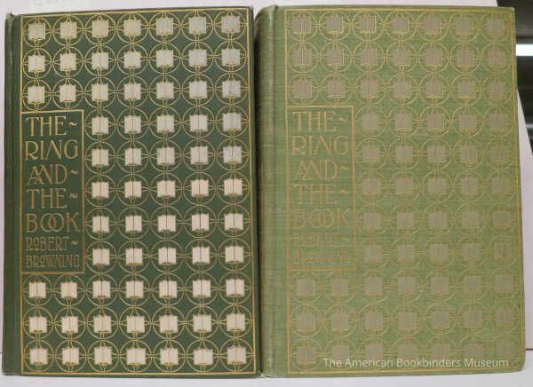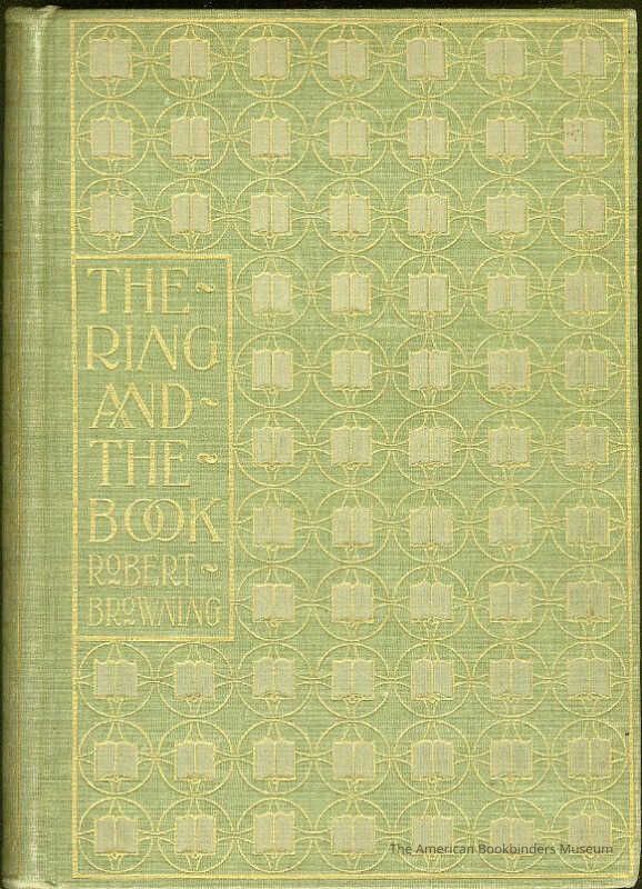 Unsigned binding, likely Henry Thayer/Decorative Designers. Repeating pattern of an open book stamped in pale lavender grey within interlocking gold rings on vertically ribbed light olive green cloth. Pattern repeated on spine. Top edge gilt.Relationships