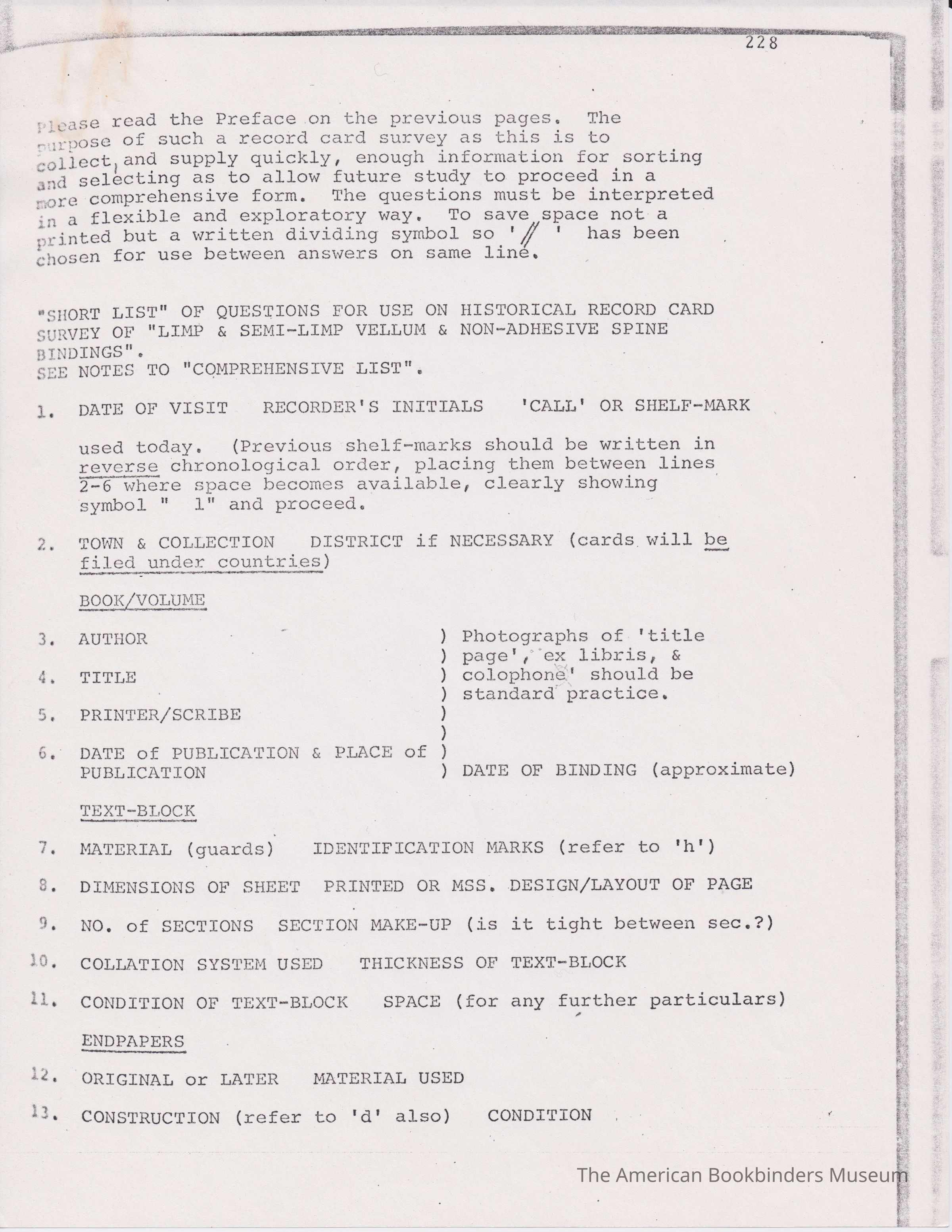 Photocopies suggesting what information to gather on limp and non-adhesive spine bindingsEntry/Object ID