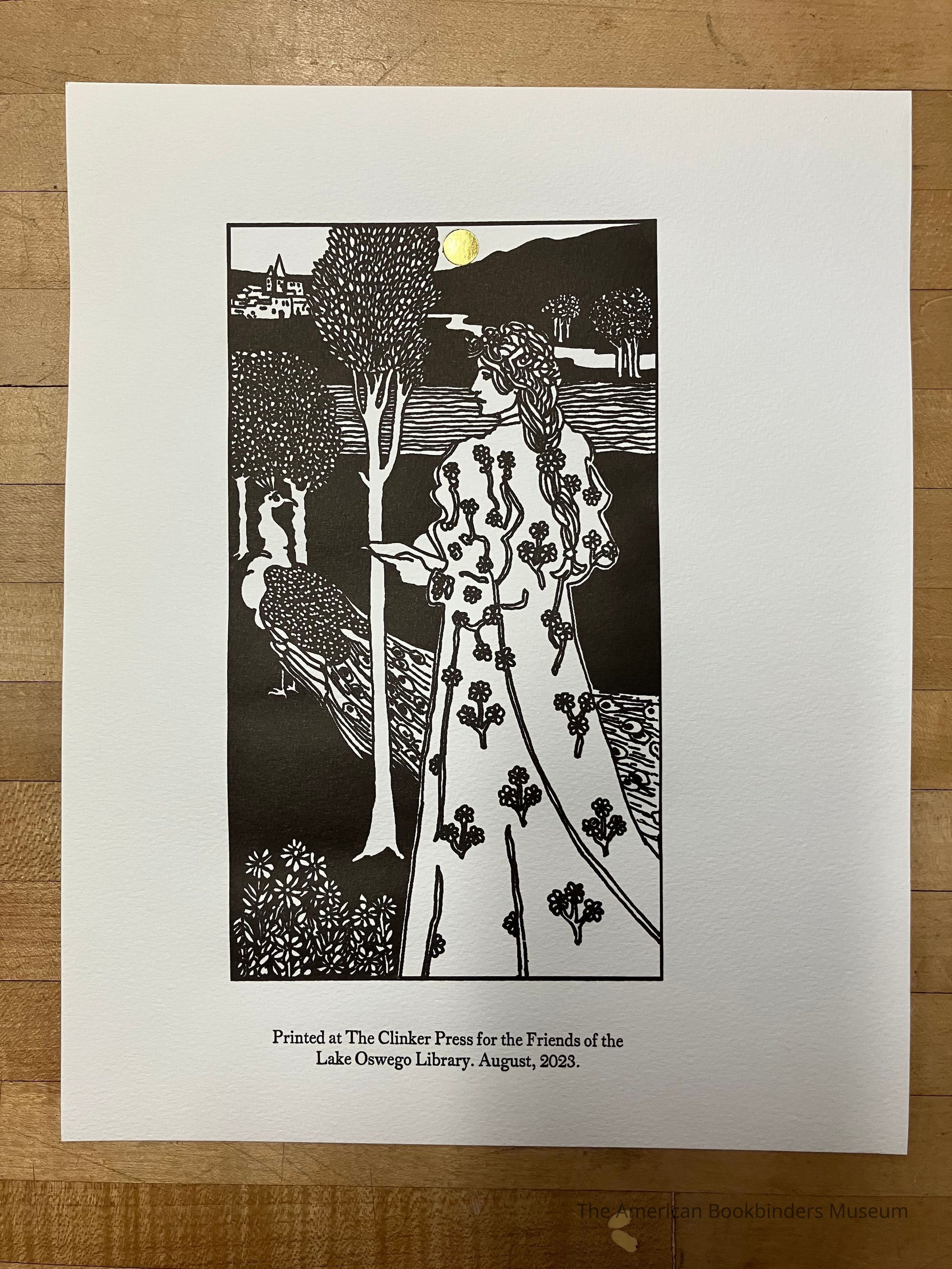 A woman with flowers on her dress in the foreground is holding a book, facing away from the viewer but looking to the left. In front of her to the left is a peacock, with tail feathers trailing to the right side and out of frame. Farther in the distance is a lak and a river that leads to a castle. In the distance is a hill, with a gold sun appearing just over it. Various trees are scattered in the landscape.Collection