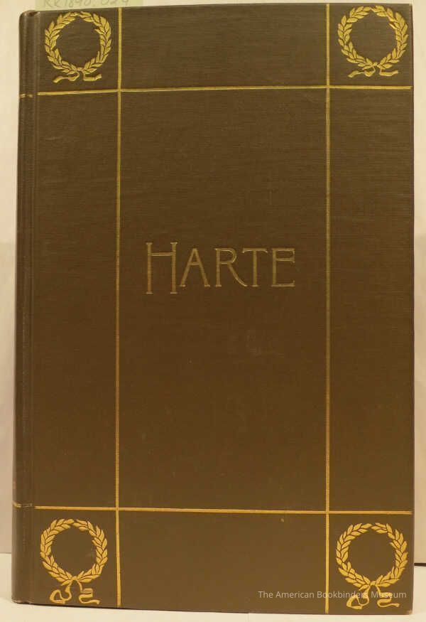 Design has features of Sarah Wyman Whitman due to stylistic devices of corner decoration within a ruled grid and the employment of wreaths, which is seen throughout her work. Bound in brown fine ribbed cloth with a simple, elegant design of four bisecting horizontal and vertical lines, forming 1/1/4 inch corners, where a gilt wreath and bow is placed. Title in center stamped in gilt. Gilt wreath is also placed to top and bottom of spine. Plain endpapers.Notes