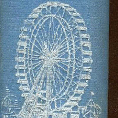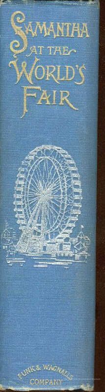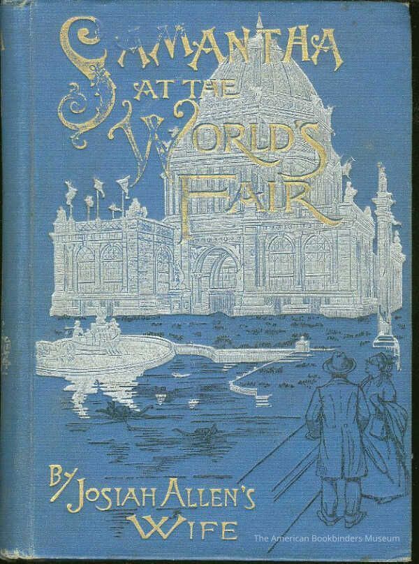 Wedgwood blue decorated cloth with design in silver, black, and gilt to front cover depicting onlookers at the Reflecting Pool, observing the huge white domed buildings of the 1893 Columbian Exposition in Chicago. Spine has titles in bright gilt with a large ferris wheel in silver stamping- the ferris wheel made its debut at the Exposition.