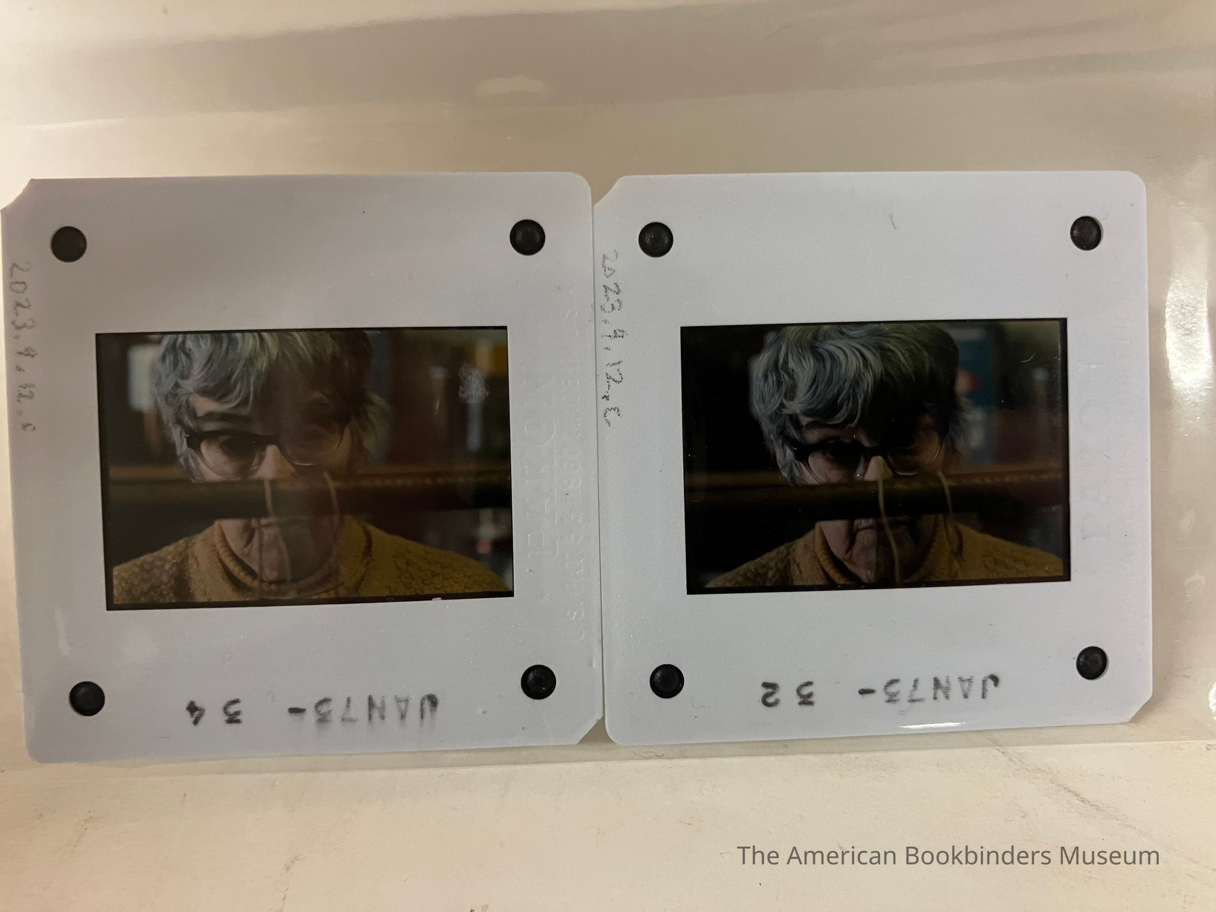 Two slides showing Patri at a sewing frame. The image is zoomed to show her at bust length with the top arm of the sewing frame cutting across the image.Photograph Details