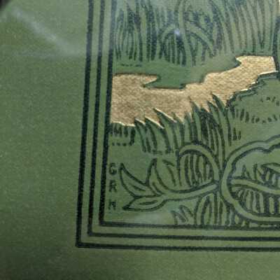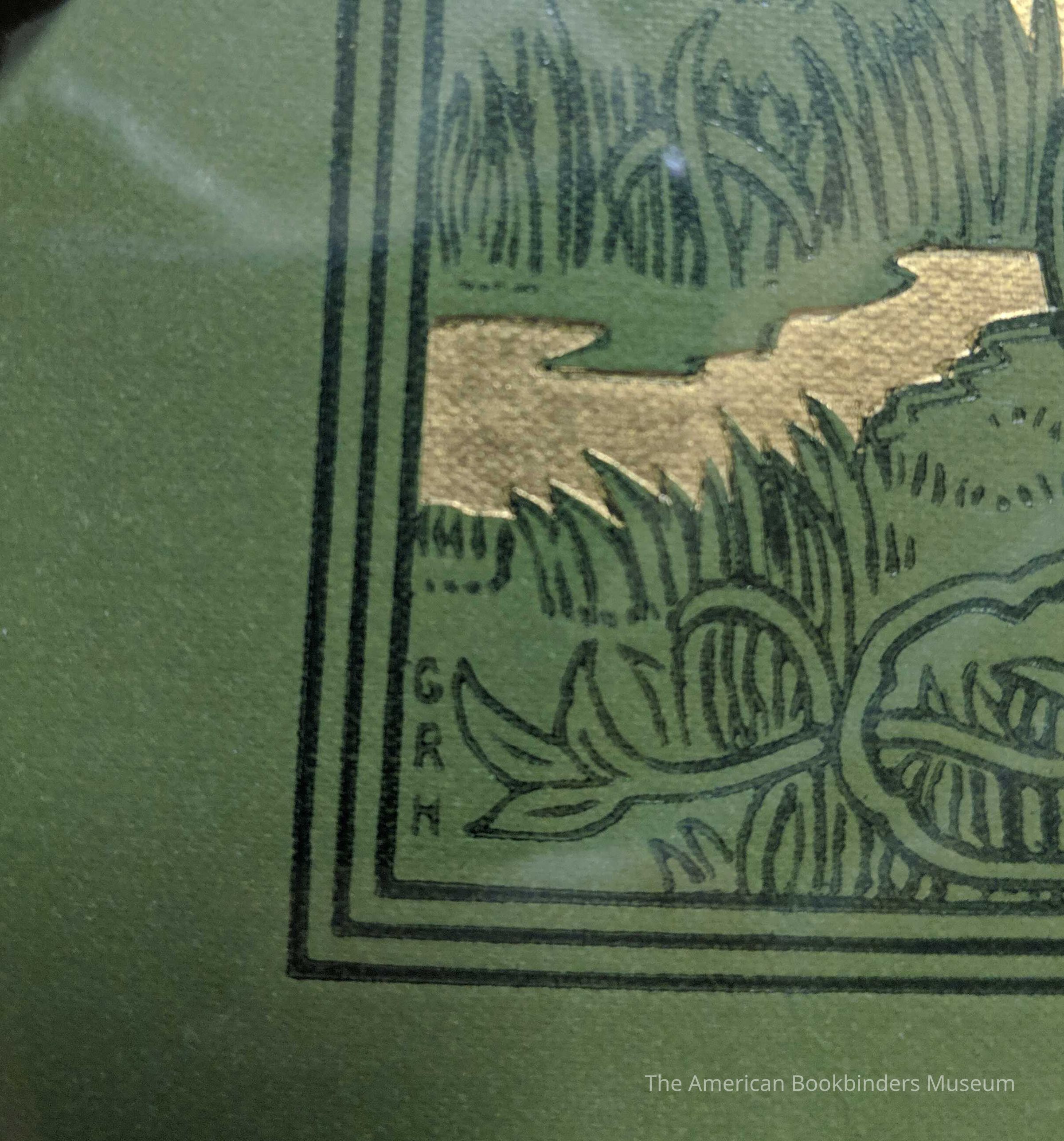 Olive green decorated cloth binding stamped in black depicts a meandering stream or river stamped in bright gilt with a person sitting by its bank under a tree, presumably in contemplation. Title is within an unfolded scroll. Signed binding of "GRH." Each page bordered with delicate olive green line drawings. Top edge gilt.Notes