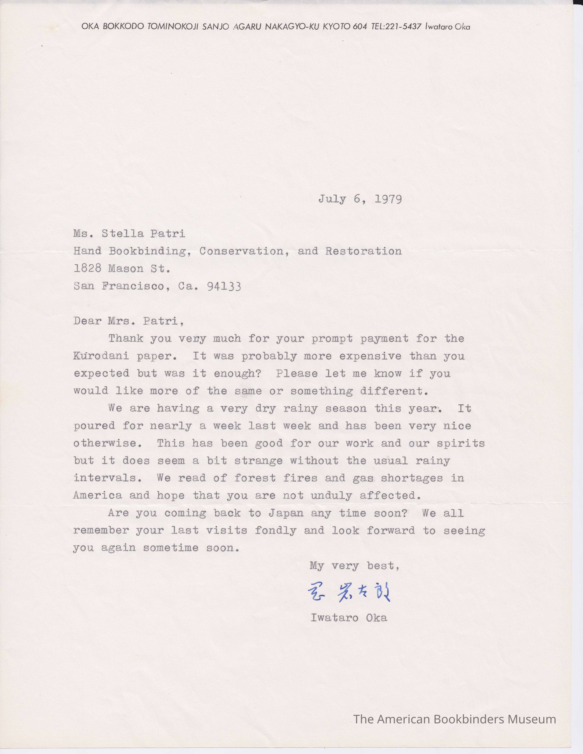 Letter from Iwataro Oka about the payment of the papersEntry/Object ID