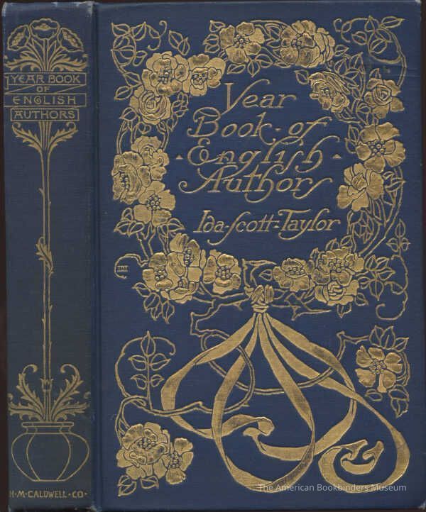 Signed binding of Decorative Designers (monogram in center left of front board). Bound in bright blue cloth with gilt stamping of a large wreath of flower tied in an elaborate ribboned bow. Art Nouveau gilt stamped spine of a Victorian ceramic pot with long stemmed flowers bisected by the title. Deckled edges. Pictorial green endpapers.