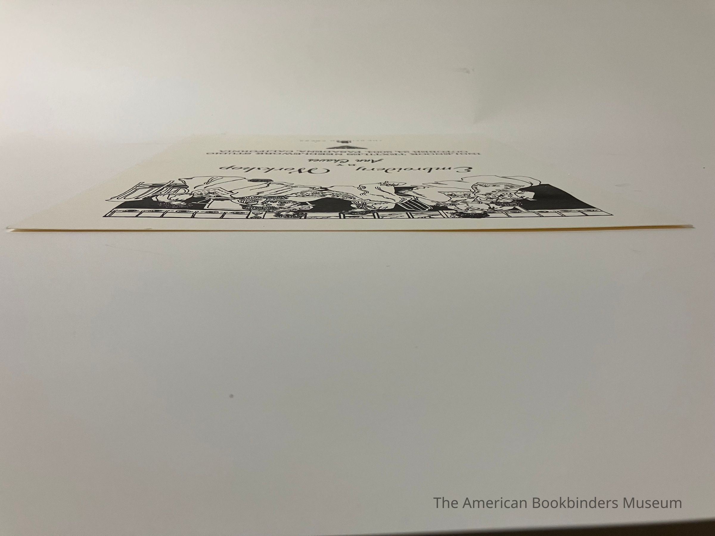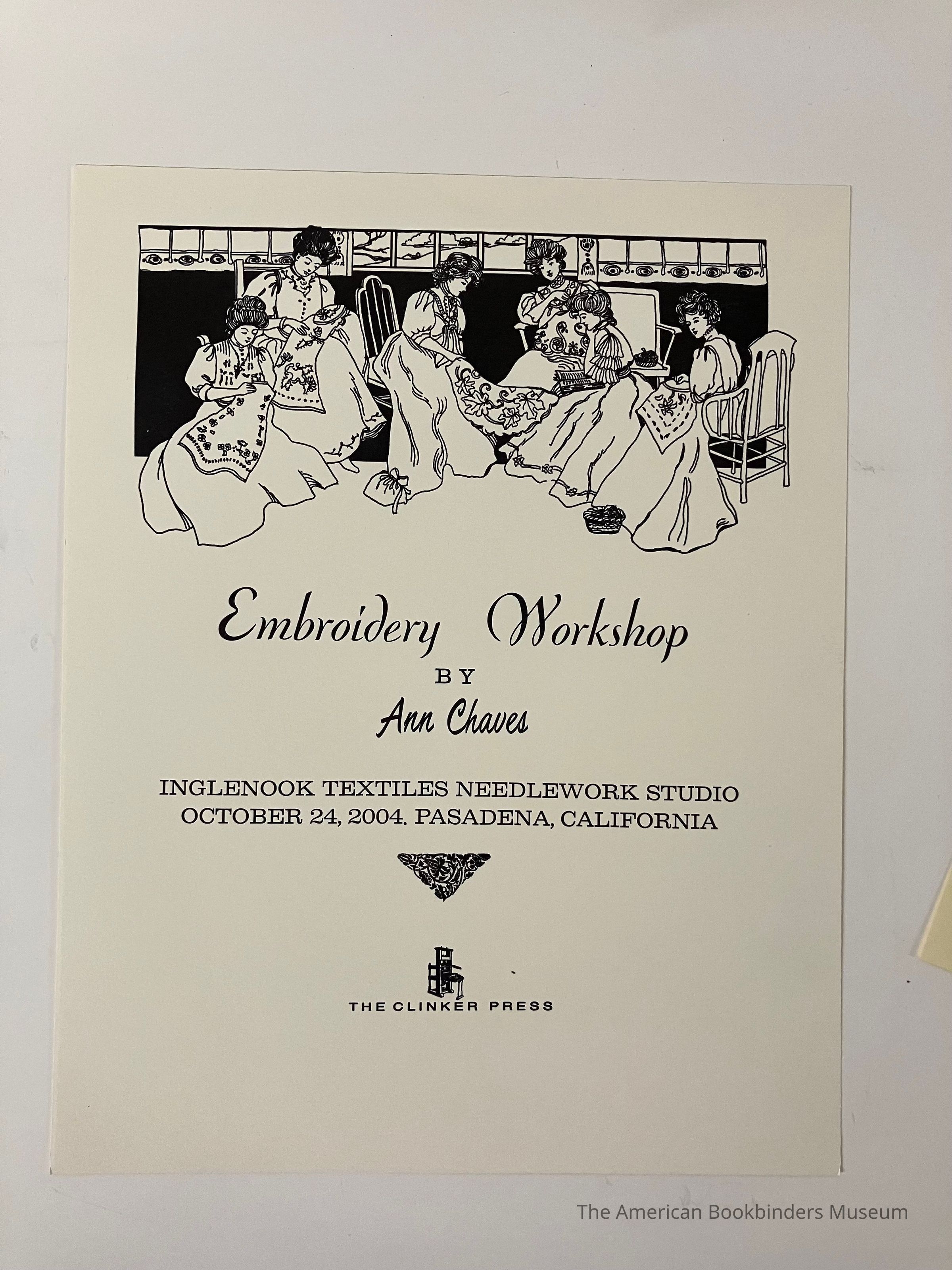 A brochure for an embroidery workshop by Ann Chaves for October 24, 2004. Top third is an illustration of several women working on embroidery, with clouds visible out the window at the top center. Text fills the lower third, with a triangular floral design. Printer's mark below.Collection