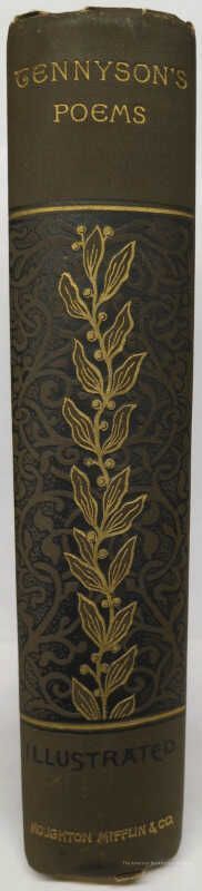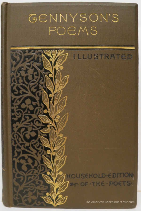 Design attributed to Sarah Wyman Whitman. Bound in beveled brown cloth with black and gilt stamping in an asymmetrical vertical panel design of interweaving vines in black and leaf and bud vine in gilt. Title in gilt and series title: "Household Edition of the Poets" in black to bottom of cover. Same motif repeated to spine. Brown stone endpapers. All edges gilt.Notes