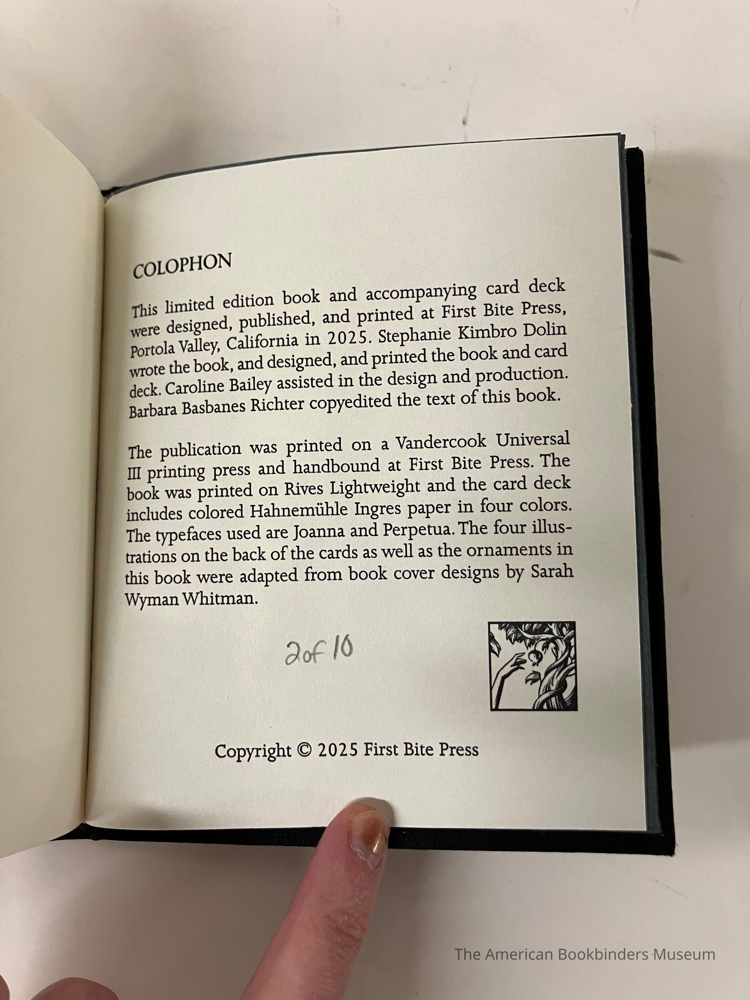 Colophon - designed, printed, published, bound at First Bite Press. Printed by author. Barbara Basbanes Richter copywriter text. 2 of 10.