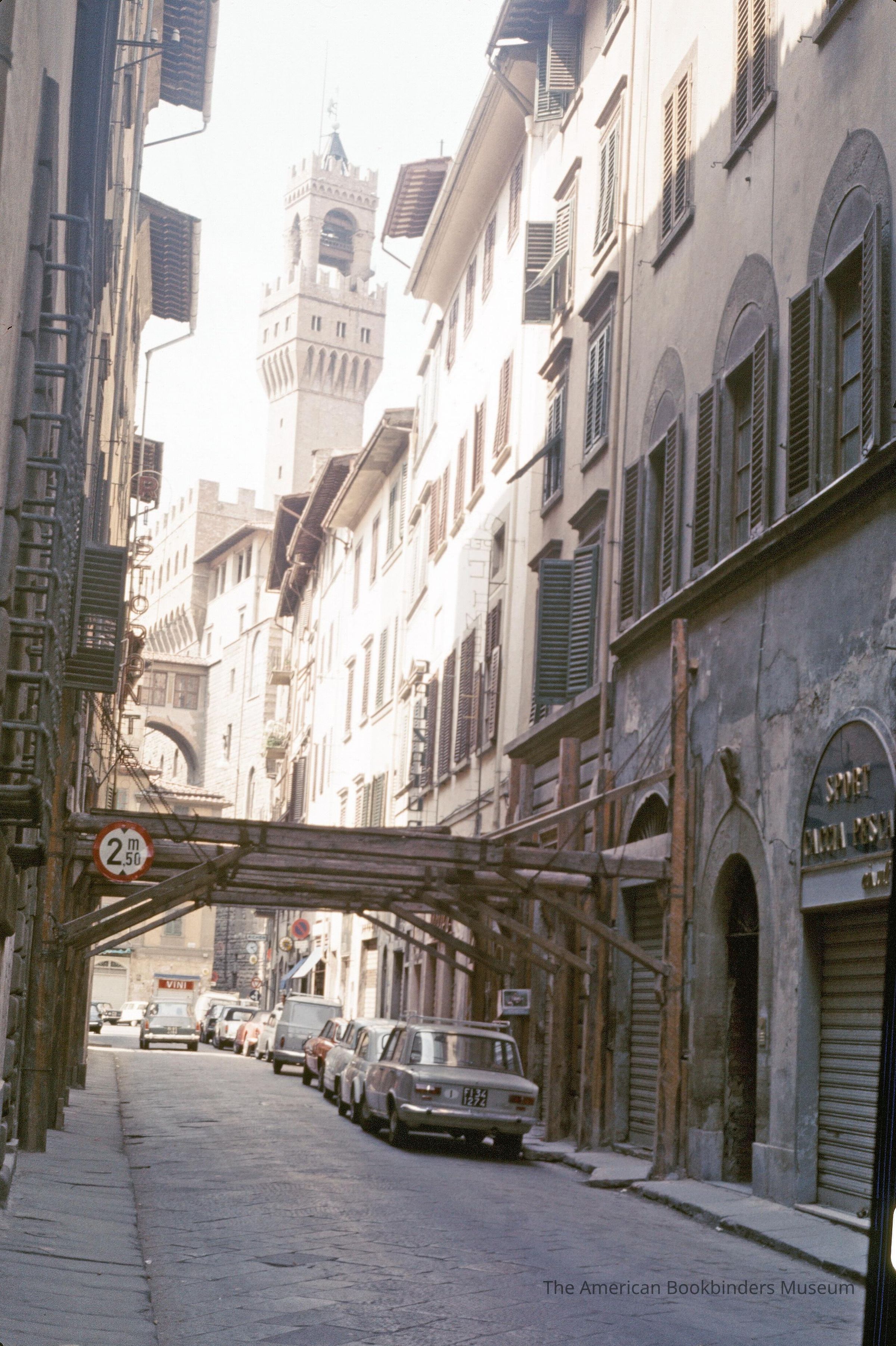 A scanned photo showing a narrow street in Florence. The left side is being supported, with the right side bracing the support system. The Palazzo Vecchio may be in the background.Photograph Details