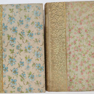 Bound in a wide white cloth spine stamped in an embossed gilt floral design. With glazed pictorial paper covered boards to cover in a branch and flower design printed in gilt, blue, and green against a cream background. All edges gilt. 636pp. Binding represents a style which was extremely popular at the turn of the century noted for white spines and repeating small flower patterns in calico-like cloth or paper - obviously marketed to the feminine buyer.Notes