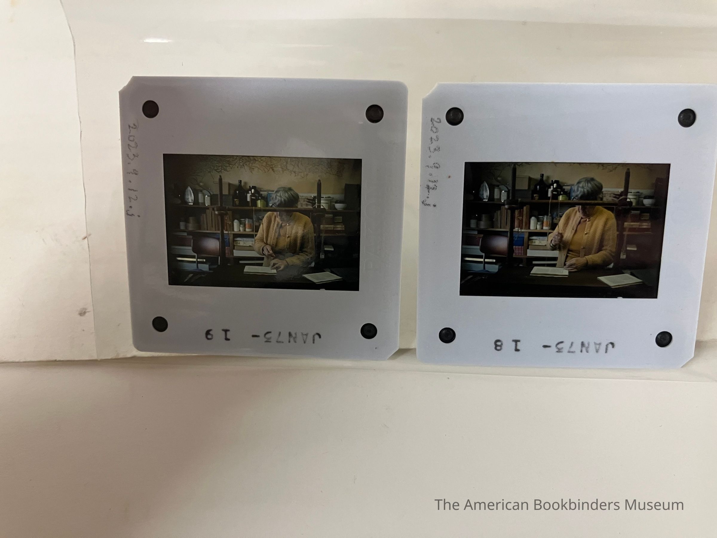 Two slides showing Patri behind a sewing frame. Various bookbinding materials are on the shelves behind herPhotograph Details