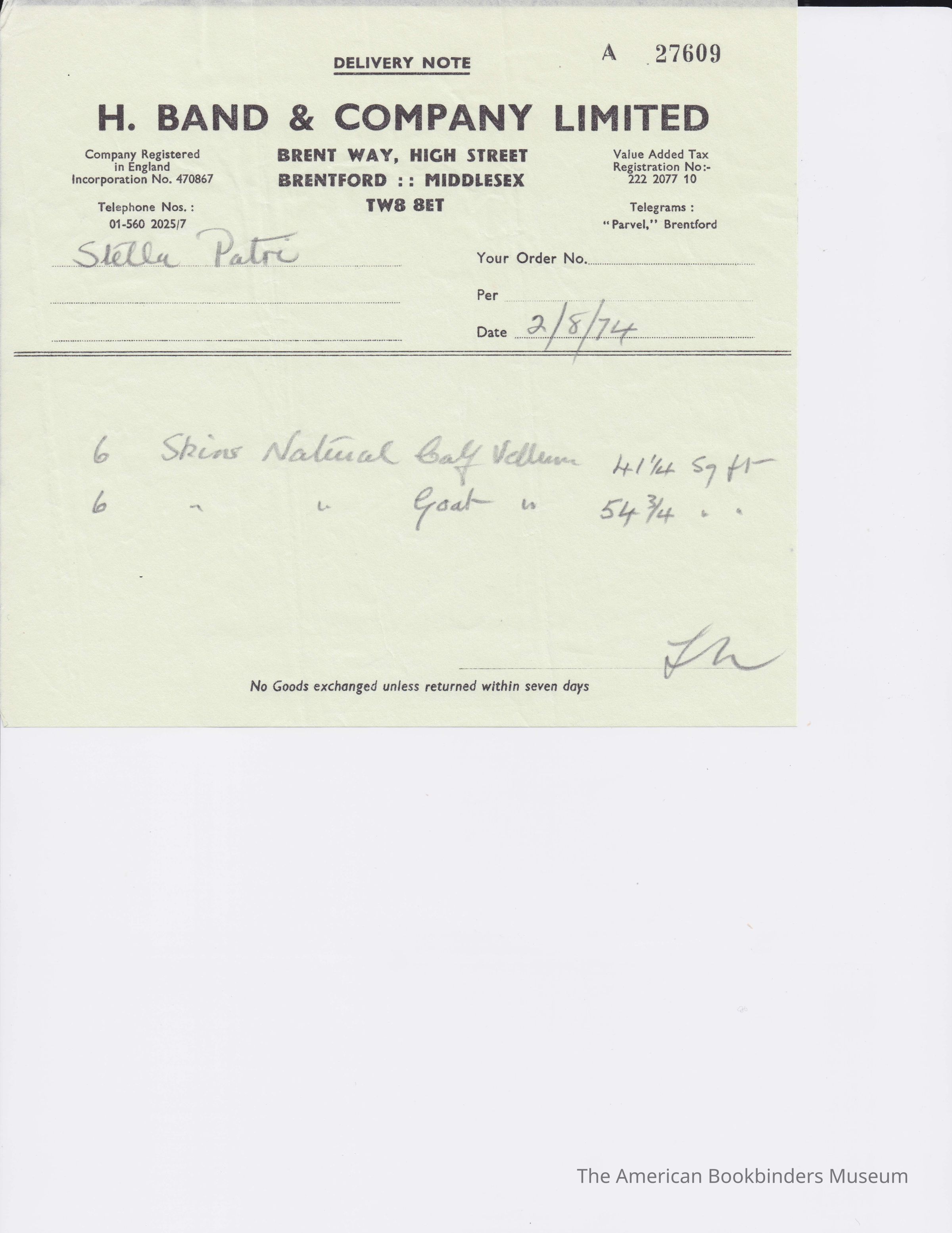 Patri's letter to order vellum from H. Band & Co., Ltd. Forms showing the order failed to be delivered, and instead Patri was repaid at market value. A letter from the company notifying Patri they had stock and would be happy to do business. An international money order of Patri attempting to order again mid September. A delivery notice dated to February.Collection