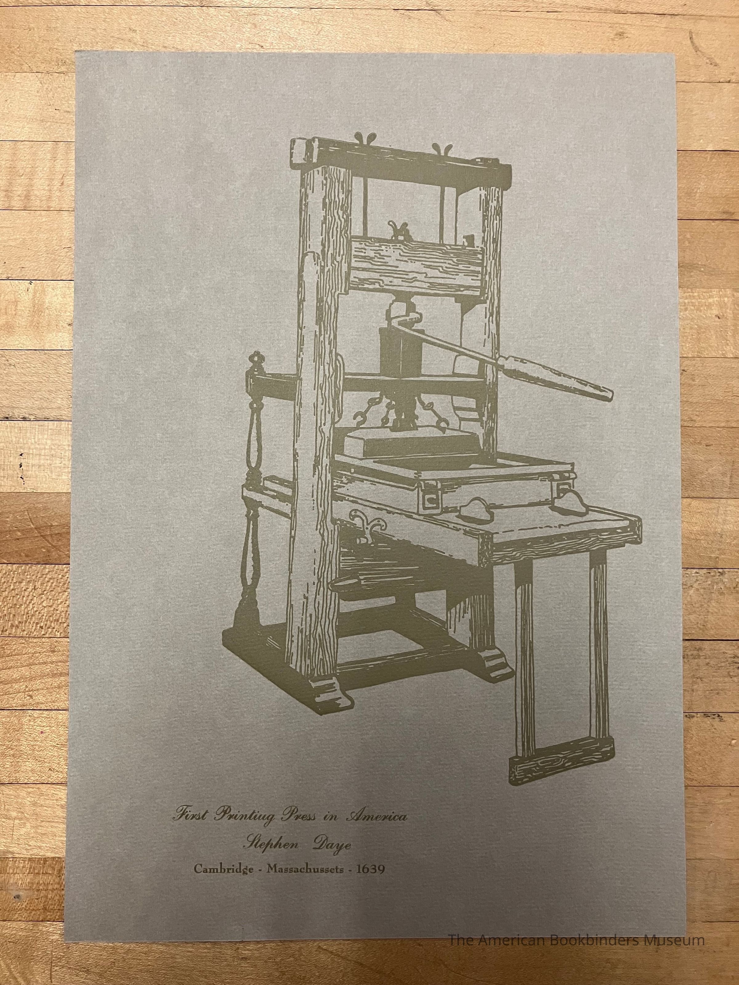 Thin gray paper. Illustration of a flatbed press, fills the center, mostly wood. In the bottom left is 'First Printing Press in America, Stephen Dye. Cambridge, Massachusetts, 1639'. Gold ink.Collection