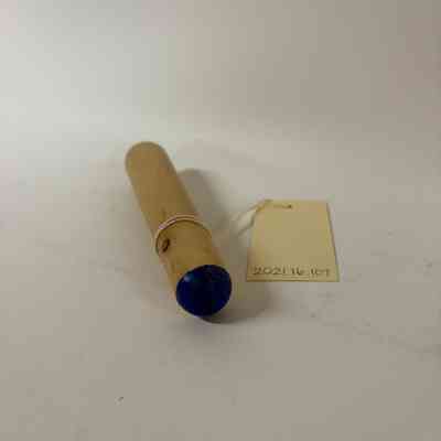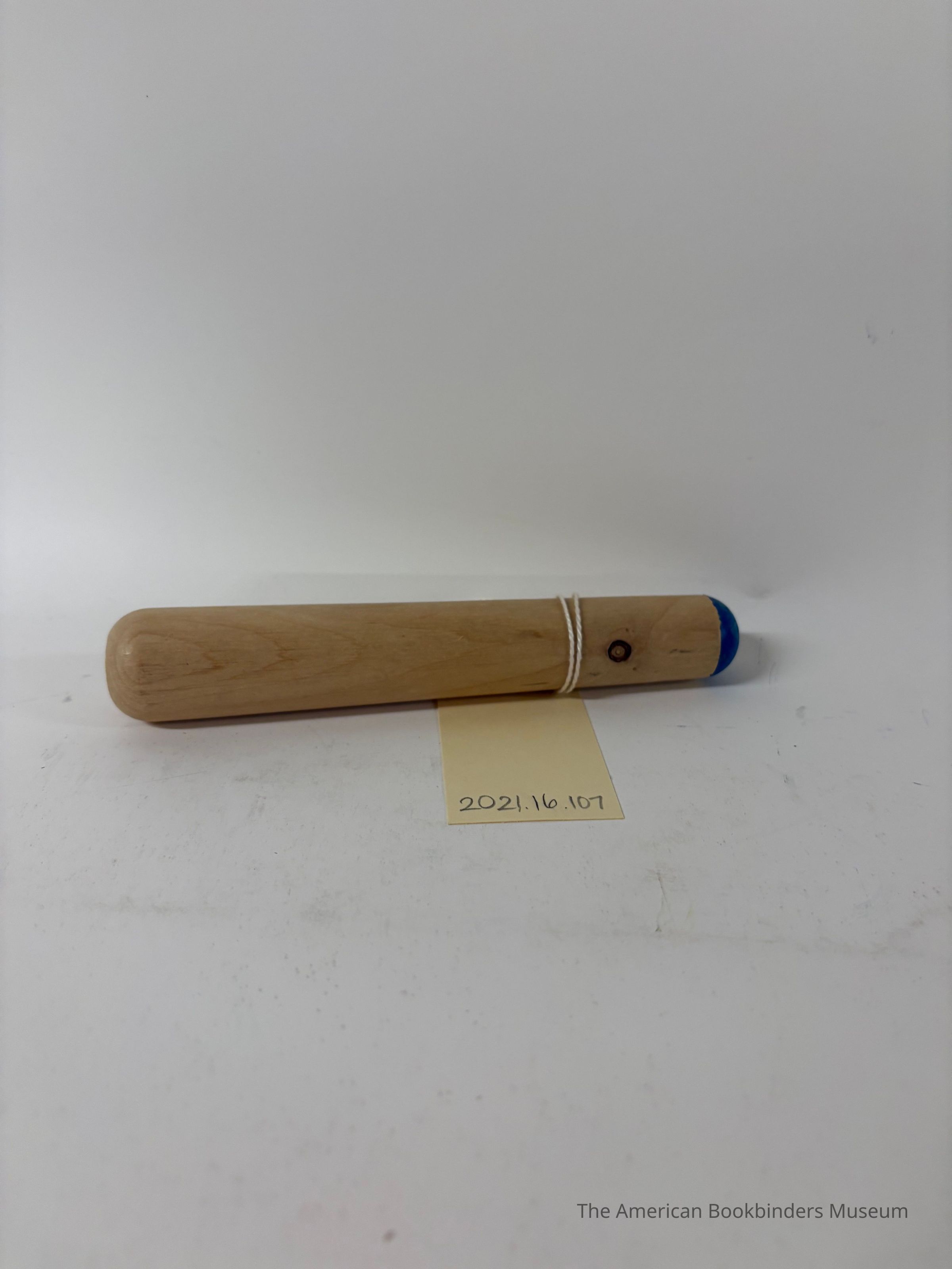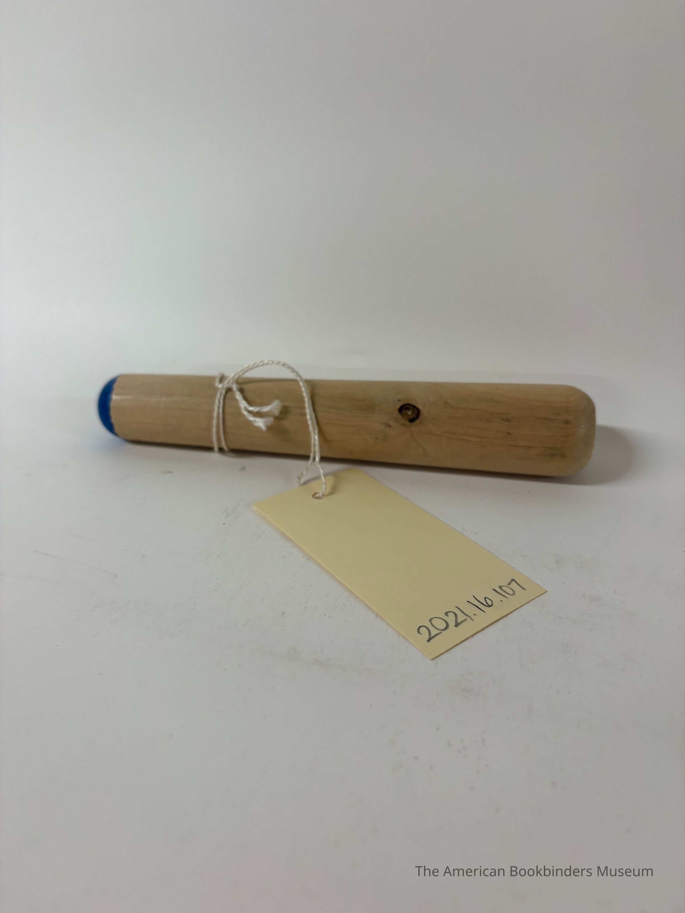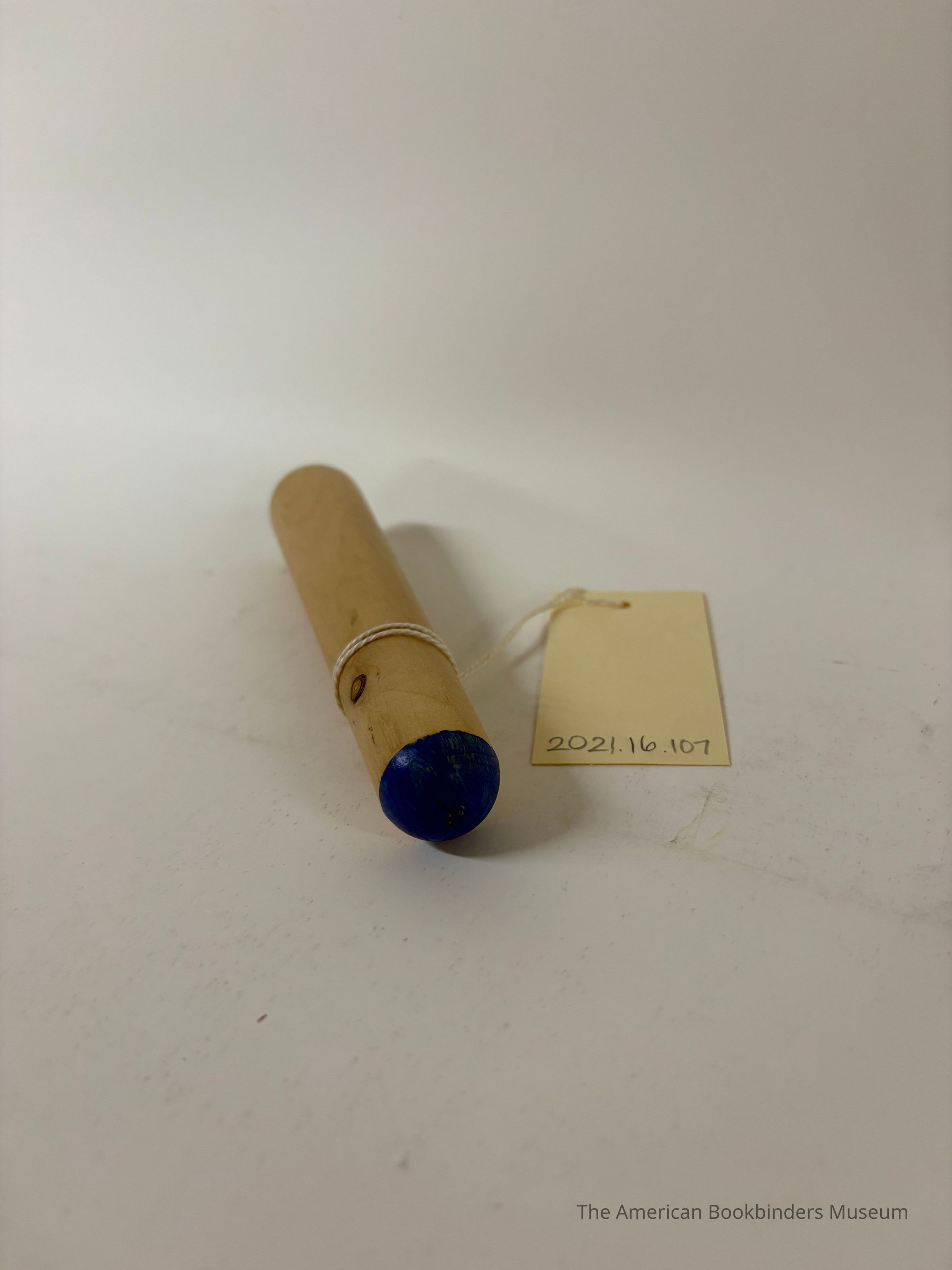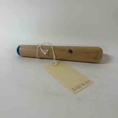 Light wooden hand stamp handle with blue-painted tip and round edges