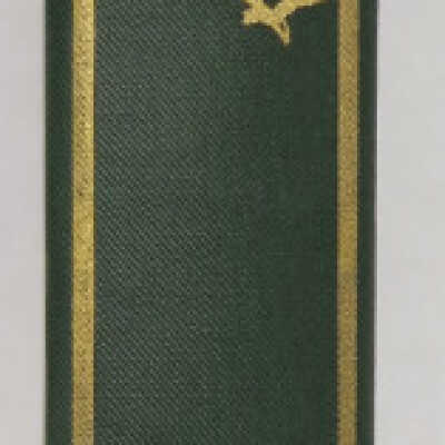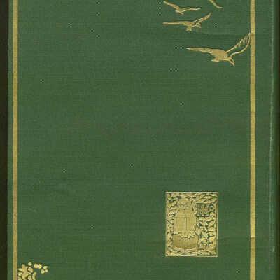 Bound in flexible green diagonal-fine-rib-grain cloth in a wrap-around design, signed by Bertha Stuart. Black and white photographic scenic endpapers. All edges gilt. Design is of a scene of large masted sailing ships upon swirling ocean waves. Title is within a framed center rectangle with motif of flying ocean birds in the foreground. This motif is carried over the spine and onto the top right corner of the rear cover, where a group of birds soar. The bottom of the rear cover depicts swirling waves - all in gilt. The entire design is created using only bright and matte gilt. The overall design is very Asian inspired. The right rear corner, also in gilt, has the Henry Holt monogram with owl (very unusual). Book was also issued in red cloth with slightly different details to rear design.