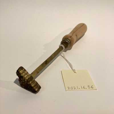 Hand stamp with wood handle. 3.5cm design, curling embellishments fanning out symmetrically from vertical line cut through center.