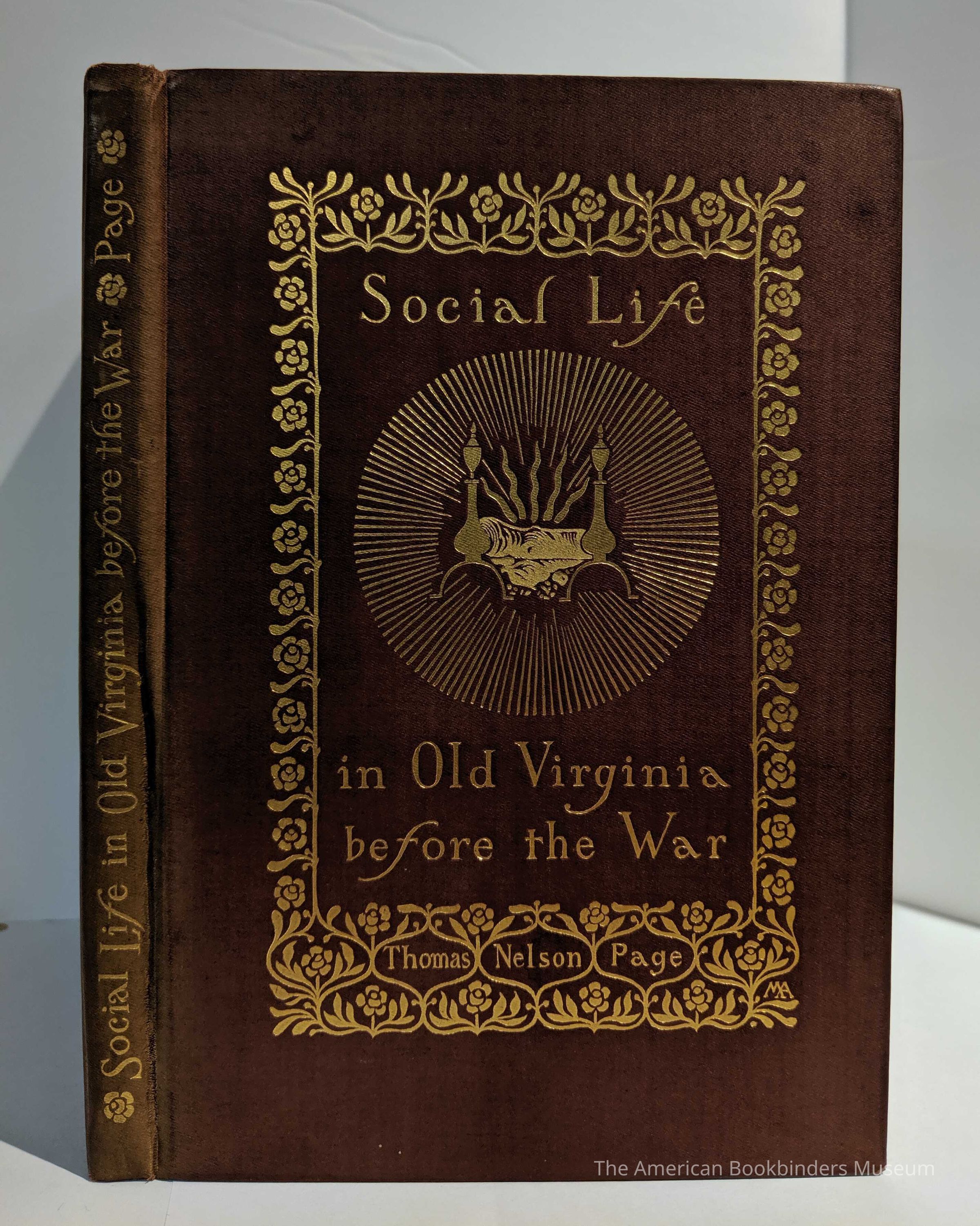 Bound in a dusky rose, smooth-grain cloth and stamped entirely in gilt, the design is of two andirons with a blazing log radiating warmth, depicted by a circle of rays surrounding the hearth. This is enclosed within an art nouveau border of leaf and flowers, more typical of her later work. The imagery of hearth and home is representative of the text, which waxes poetic about the loss of plantation life and the genteel South. Top edge gilt.