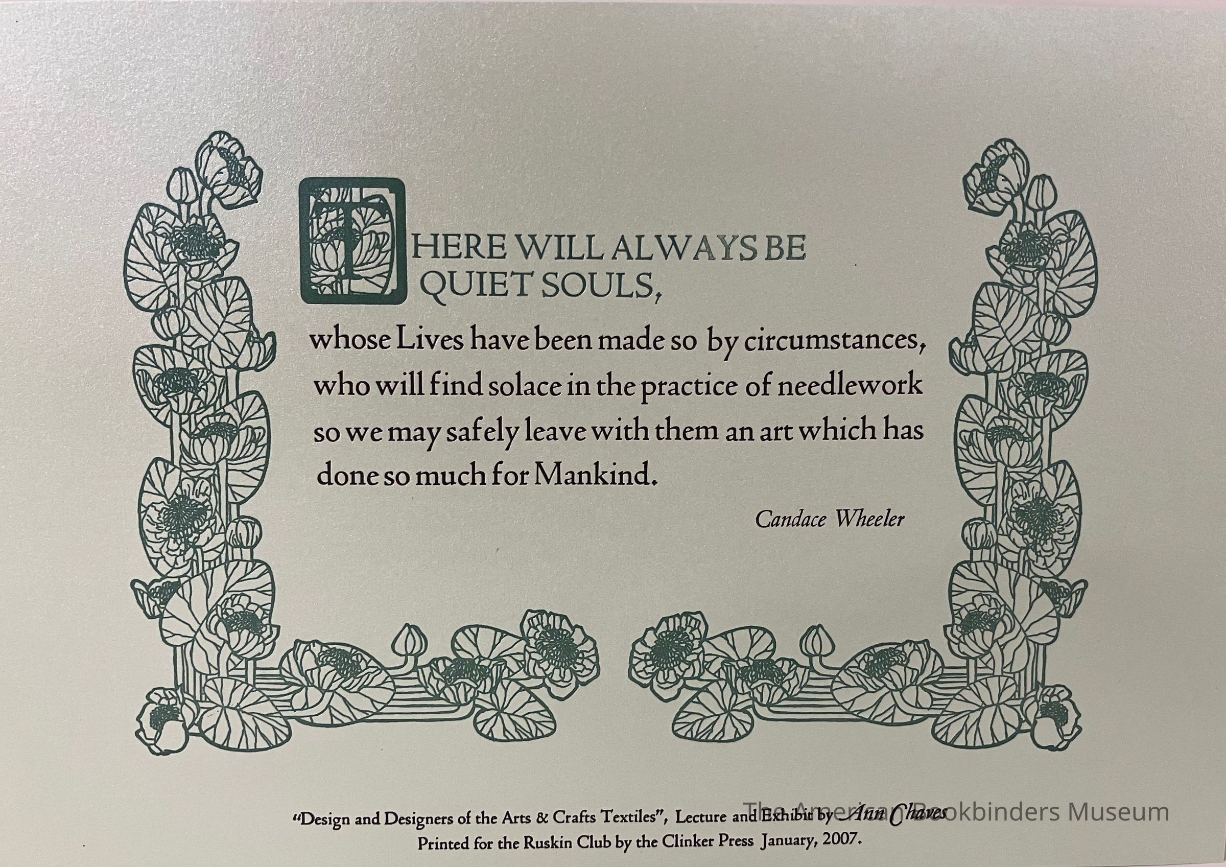 A light green page printed with a quote by Candace Wheeler. Set in a frame of flowers, leaves, and stems.Collection