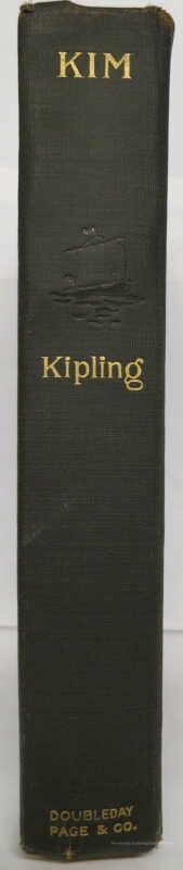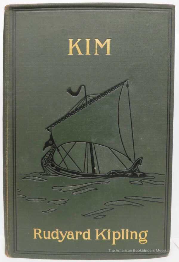 Bound in dark green cloth with an Asian sailing ship stamped in black to the front cover. Motif repeated to spine. Titles in gilt. Top edge gilt. Deckled edges. One of a series of uniform bindings for Kipling titles issued by the publisher.