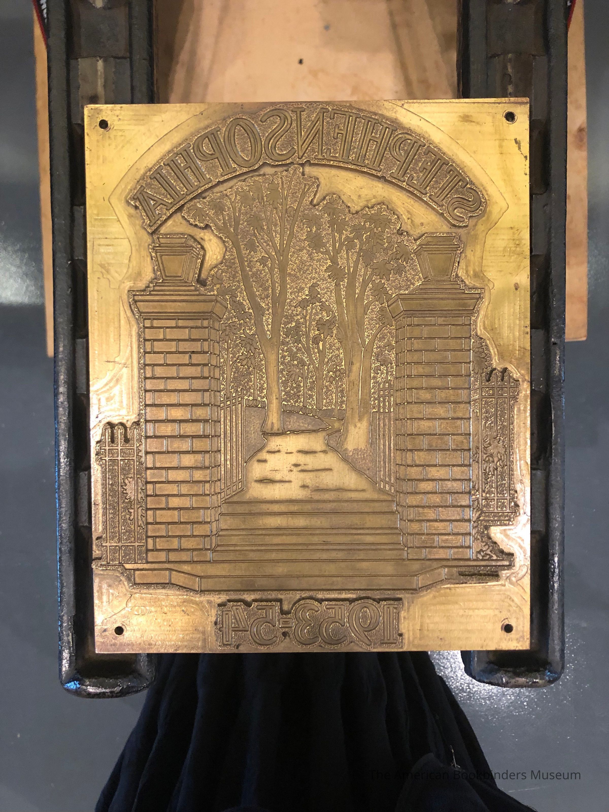 A full page inking plate, with 'Stephensophai' across the top. Shows an entrance to a gated park, with the gates open. At the bottom is '1953-1954'.