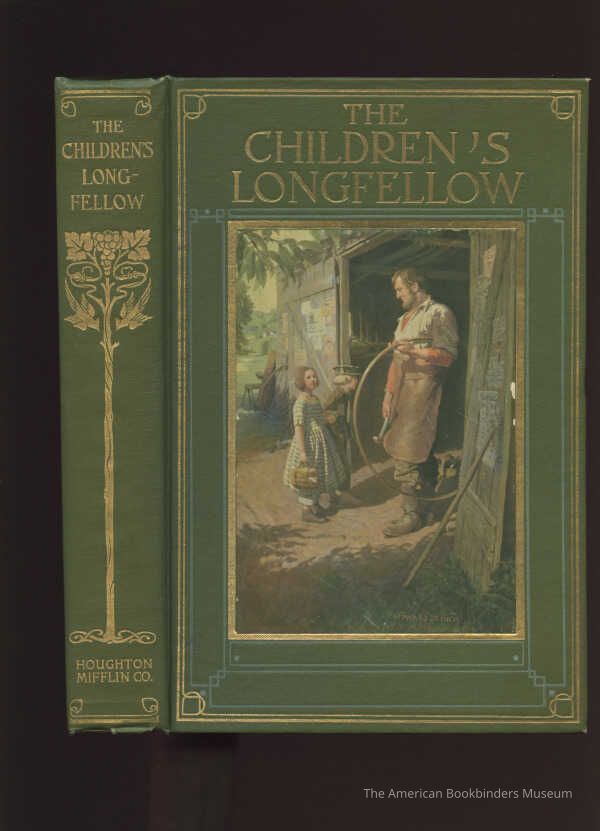Bound in olive green cloth with gilt titles and decoration to cover and spine. Spine has a marvelous art nouveau decoration. Cover has a gilt stamped border paste-onlay illustration of a blacksmith talking to a young girl. Publisher's green stain to page edges.