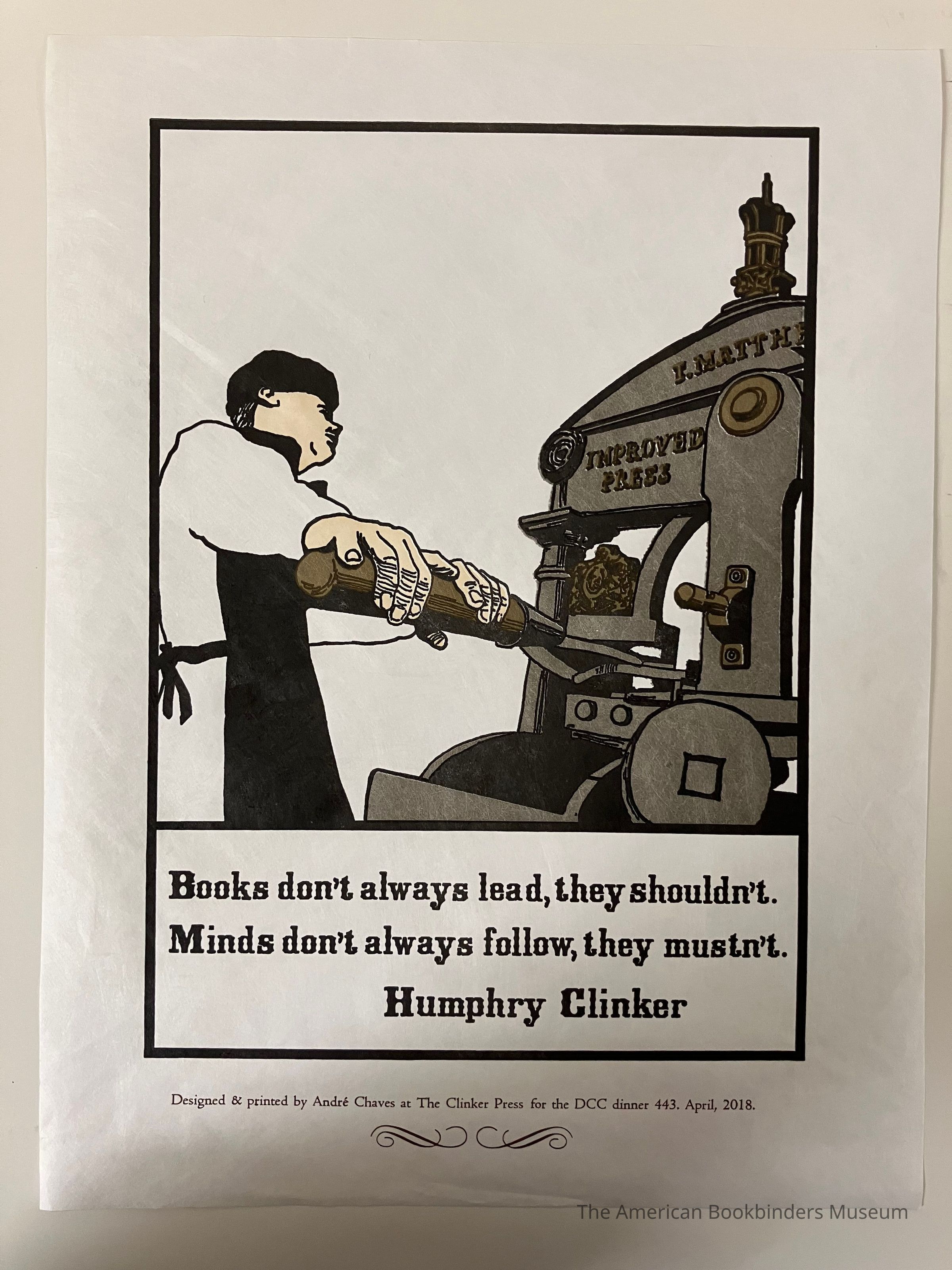 Top section is an illustration of a man at a vertically oriented press, pulling the handle. Text fills the quarter of the page below. Underneath is printing information. On a thin white paper that feels like wax paper.Collection