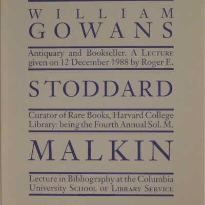 'Put a resolute hart to a steep hill' : William Gowans antiquary and bookseller : a lecture : given on 12 December 1988, the fourth Sol. M. Malkin lecture in bibliography / by Roger E. Stoddard.Entry/Object ID