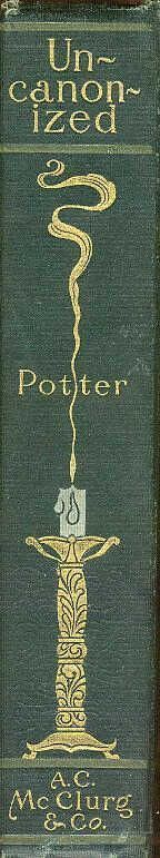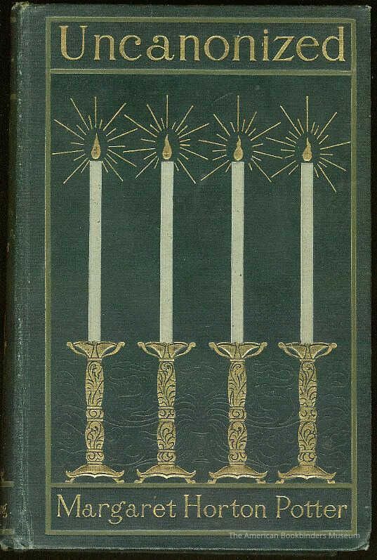Dark green cloth with light green bordered design of four gilt candlesticks with white candles and gilt radiant flames. Motif is repeated on spine decoration which shows one candle burned down and extinguished with smoke wafting upward.