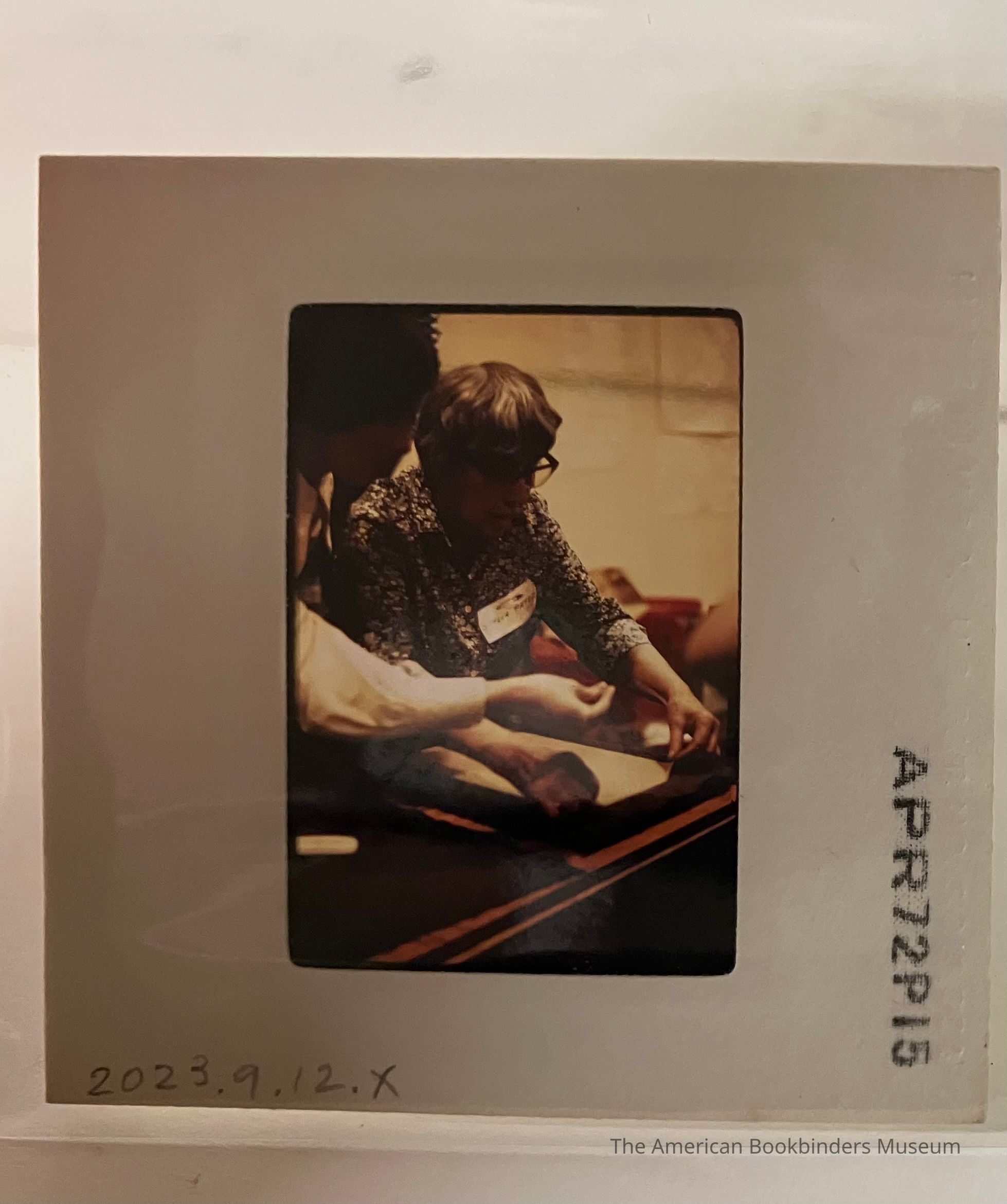 Slide showing Patri beginning to lift up a piece of freshly made paper. A woman stands closer to the camera, giving directions.Photograph Details