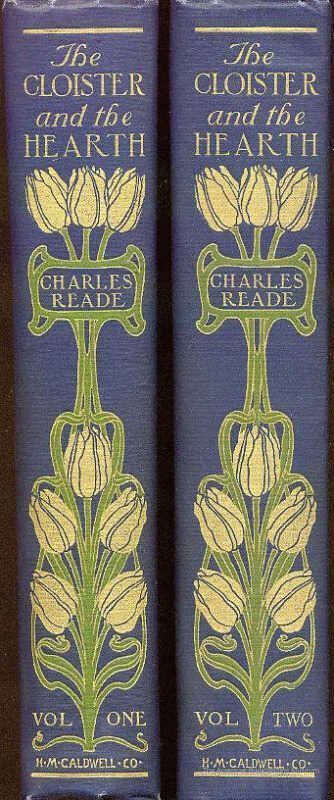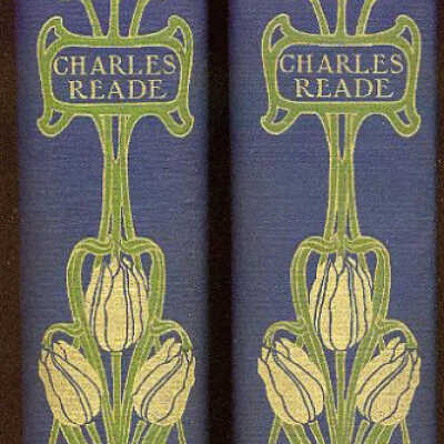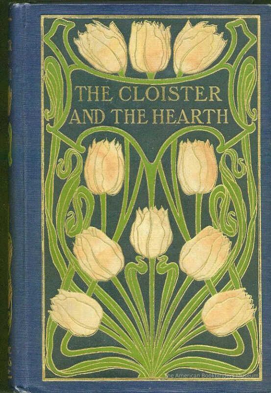 Art nouveau design in navy blue cloth with a decorated cover of intertwining tulip stems in green outlined with gold with their tulip blossoms in an unusual ivory and shaded salmon color combination, possibly achieved by using a hand dyed cloth, as each tulip blossom is different in shading and each is also raised from the rest of the decoration. Tulip motif repeated in green and gilt on the spines. Top edge gilt with side and bottom edges deckled.