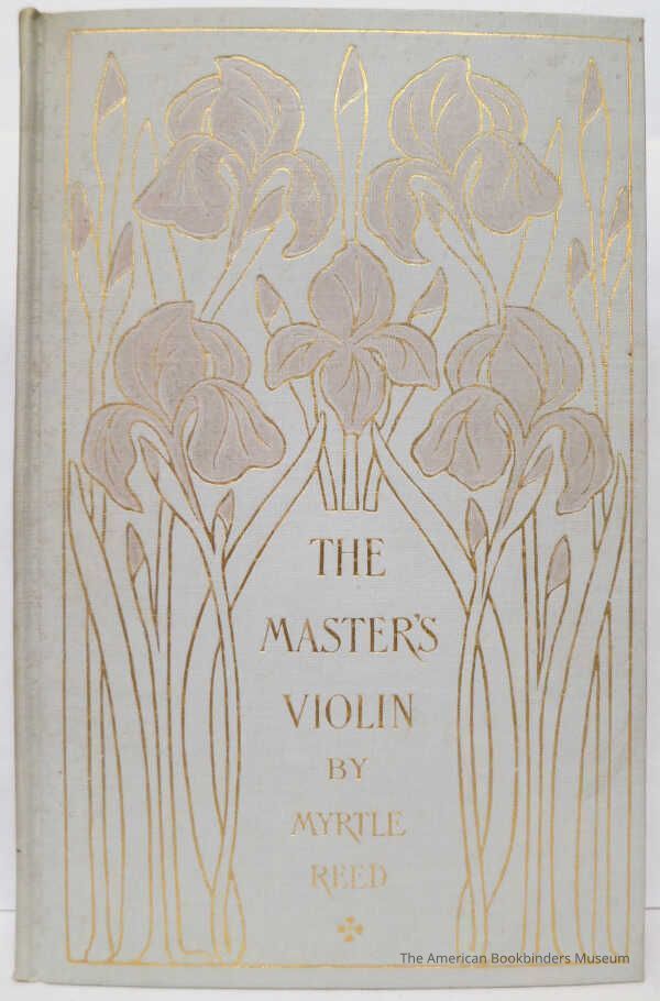 Art nouveau gilt stamped design of intertwining iris by Margaret Armstrong. Binding is unsigned. Bound in ivory/grey cloth with elaborate gilt spine decoration and titles in gilt stamped iris design, but in variant cloth color and pale grey stamping to iris.