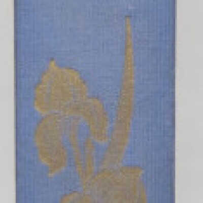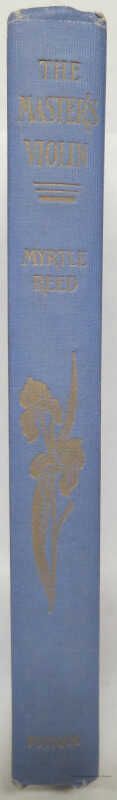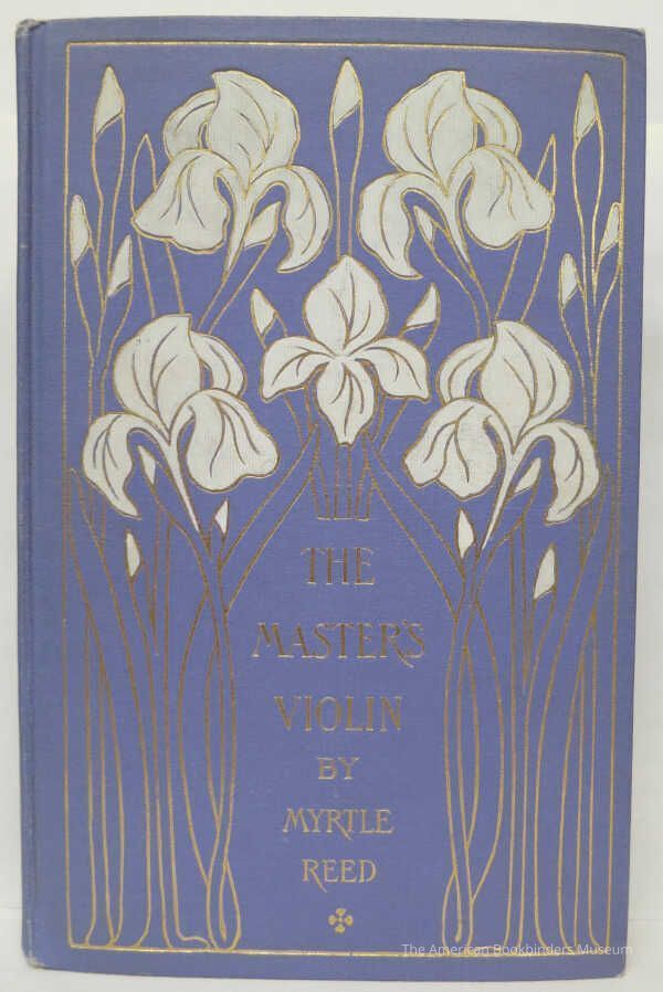 Art Nouveau gilt stamped design of intertwining iris by Margaret Armstrong. Binding is unsigned. Bound in lavender cloth with elaborate gilt spine decoration and titles. Stamped in gilt and white. One of a set of Reed titles which was issued at various times by Putnam, and is sometimes seen in pale ivory/grey cloth. Top edge gilt. Deckled page edges. Notable for alternative spine decoration of two irises.