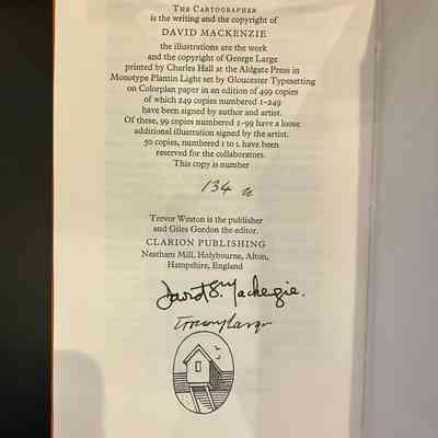 Printed by Hall at the Aldgate Press in Monotype Plantin Light set by Gloucester Typesetting on Colorplan paper in an edition of 499 copies of which 249 copies signed by author and artist. Of that number 99 have a loose additional artist. 50 copies reserved for collaborators. Trevor Weston is publisher.