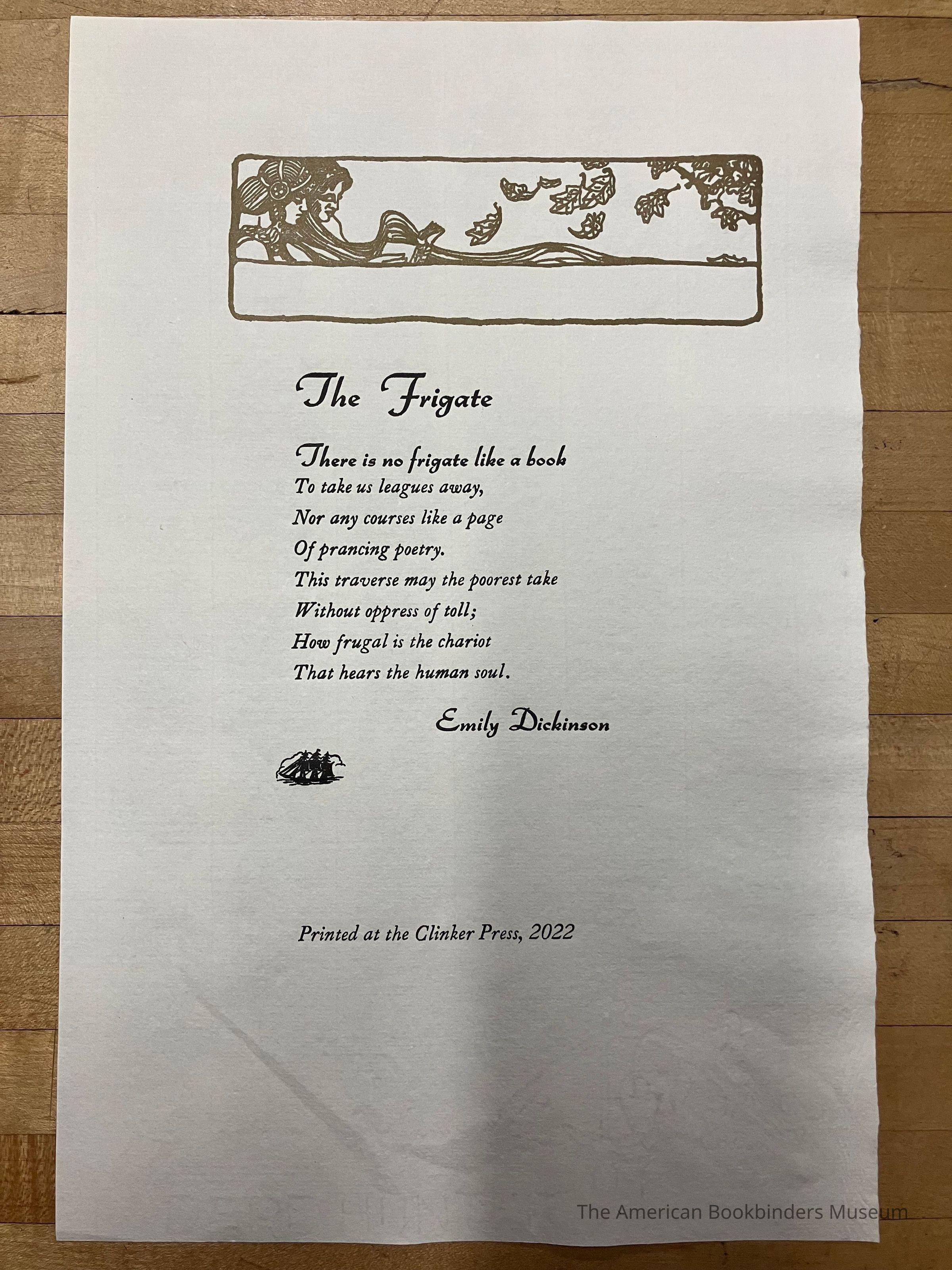 Text in black below, with a small ship at sea below. Printing information at the bottom. Right side has a series of ripples, which appears to be a result of printing not damage.Collection