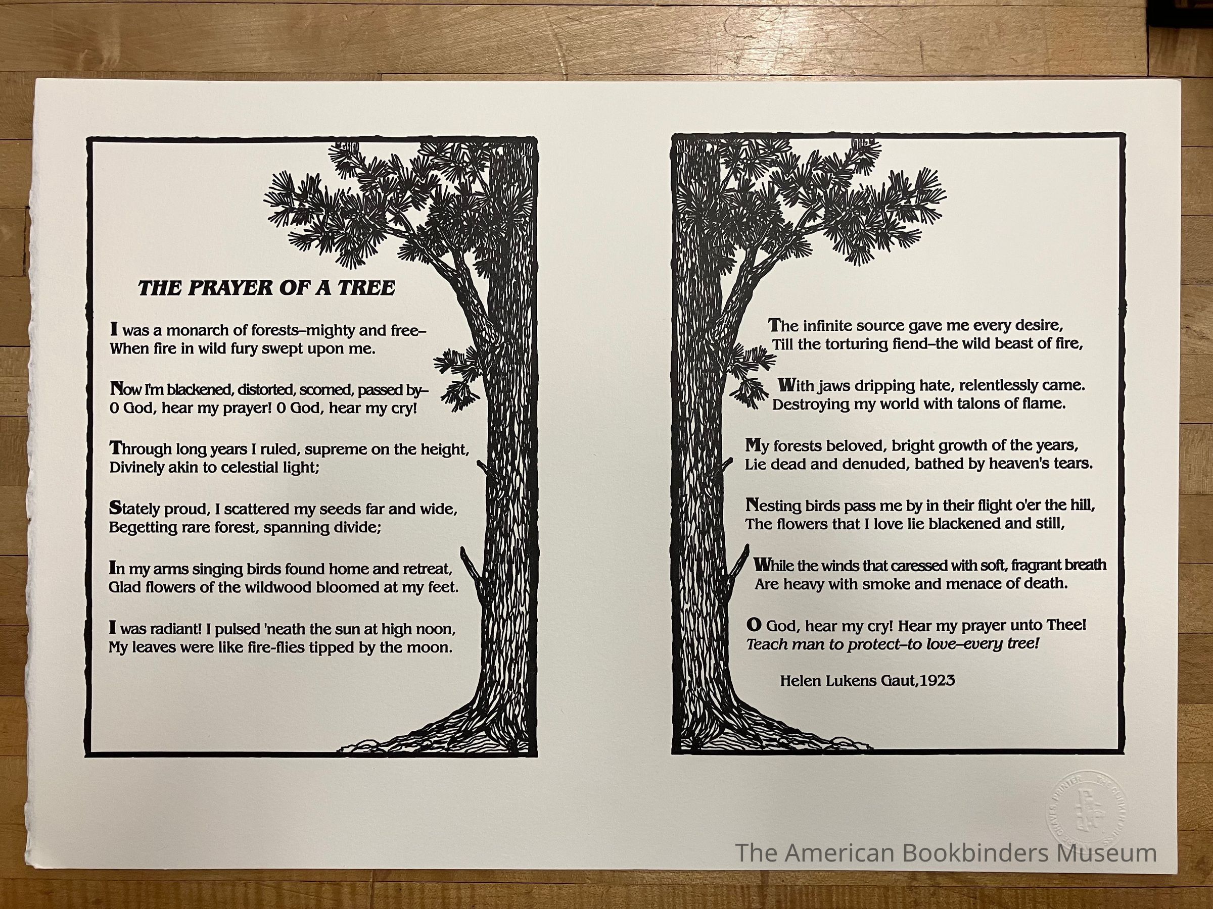 Poem by Helen Lukens Gaut (1923) split up into two sides with an illustration of a tree. Printed on cream paper, deckle / raw edge on left.Collection